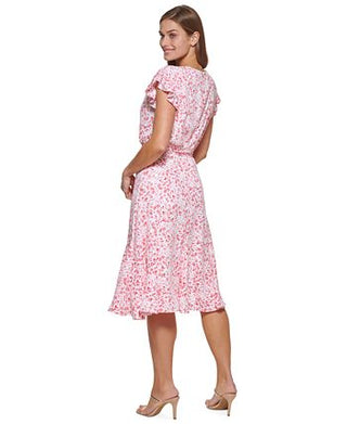 DKNY Women's Abstract Print Belted Midi Dress Pink Size 8