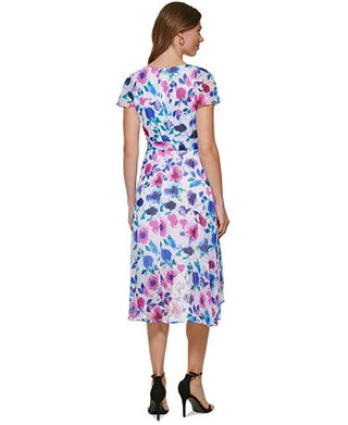 DKNY Women's Zippered Sheer Lined Floral Flutter Sleeve Surplice Neckline Midi Wear To Work Faux Wrap Dress White Size 14
