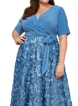 Alex Evenings Women's Tea Length Jersey & Rosette Lace Dress Blue Size 22W