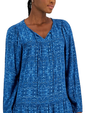 Style & Co Women's Printed V Neck Peasant Dress Blue Size Large