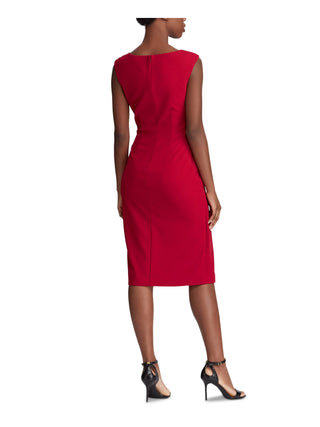 Ralph Lauren Women's Ruched Zippered Sleeveless V Neck Below The Knee Sheath Cocktail Dress Red Size 16