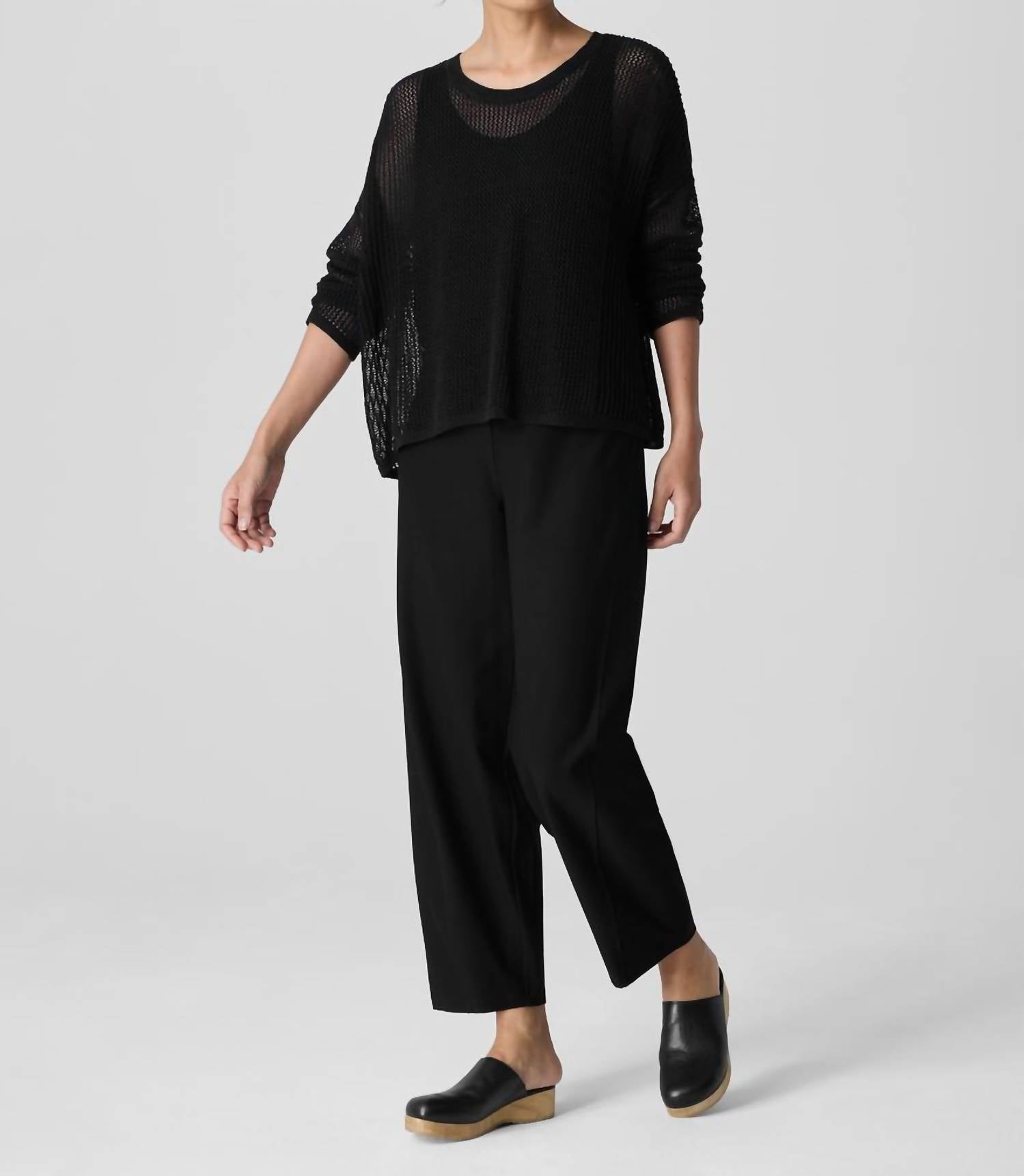 The ultimate go-to sweater, expertly crafted to provide the perfect combination of warmth and style. Its classic design and soft fabric make it a must-have addition to your wardrobe. Discover the Eileen Fisher Linen Cotton Cord Crew Neck Top, a long-sleeved, textured masterpiece in classic black. Crafted from a luxurious blend of organic linen and organic cotton, this pull-on piece ensures comfort and style. Originating from Hong Kong, its relaxed, boxy fit drapes elegantly, with a length of 22 inches for size S and 24.5 inches for size 1X. Care for this sophisticated garment by hand washing and laying flat to dry.