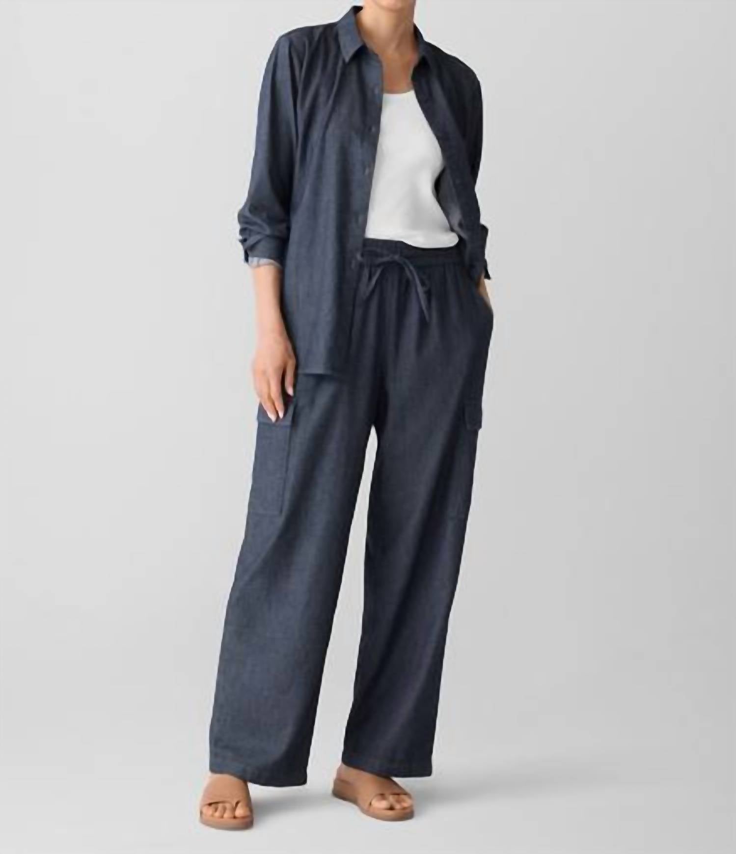 A perfectly tailored straight leg that you'll want in every color! A straight-leg cargo pant with side pockets, in indigo-dyed organic cotton. Straight through the leg. Fits the body with ease. 2-inch elastic waistband with drawstring. Slash pockets, cargo side pockets. 100% Organic Cotton.