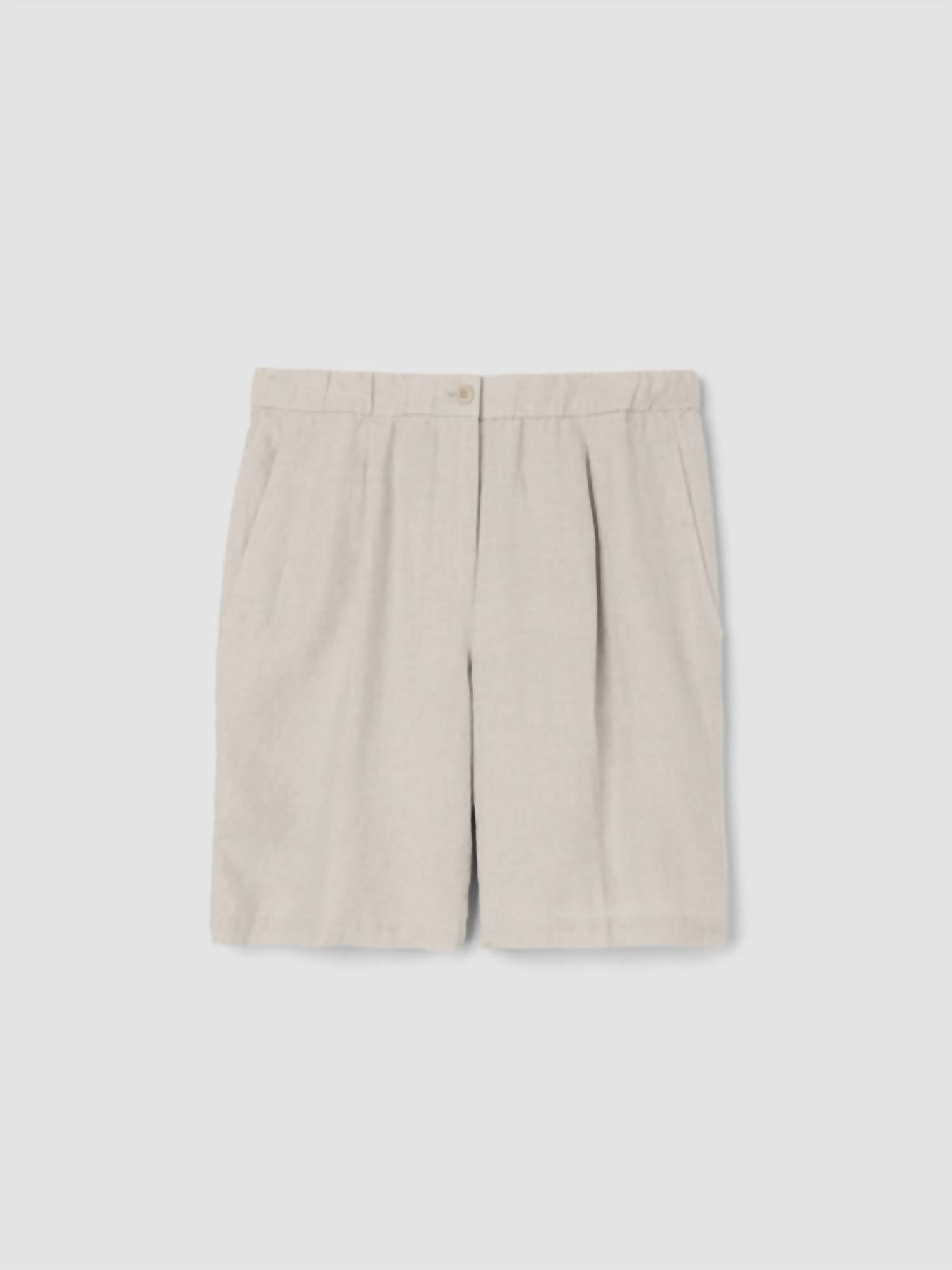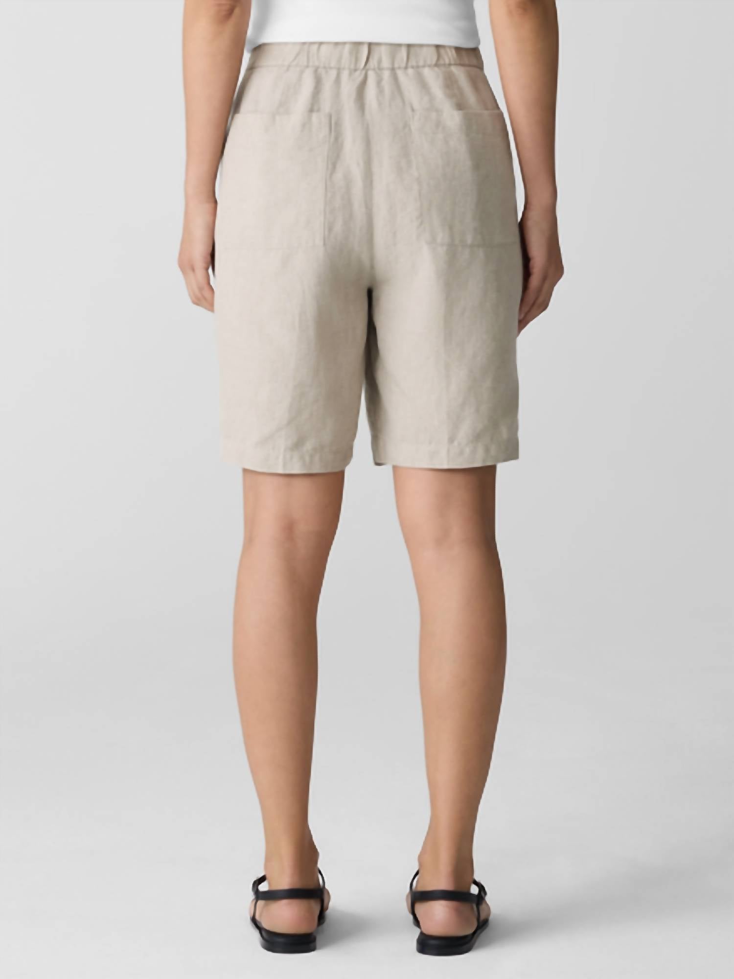 Embrace the perfect blend of comfort and style with these fashionable women's Bermuda shorts, expertly designed to offer a flattering fit and versatile wear. Easy shorts designed with a fly front closure and pockets. In signature Organic Linen—not too heavy, not too light. Straight through the leg. Fits the body with ease. Select colors may vary by store. Bo Bay is 5'9" and wears a size XS. 1 1/2-inch elastic waistband, zipper fly front with corozo button closure. Machine wash cold, gentle cycle. Line dry Front slash pockets, back patch pockets. 1-inch-deep front pleats, back darts for shape. 11-inch rise; 9-inch inseam; 11-inch leg opening (size XS).
