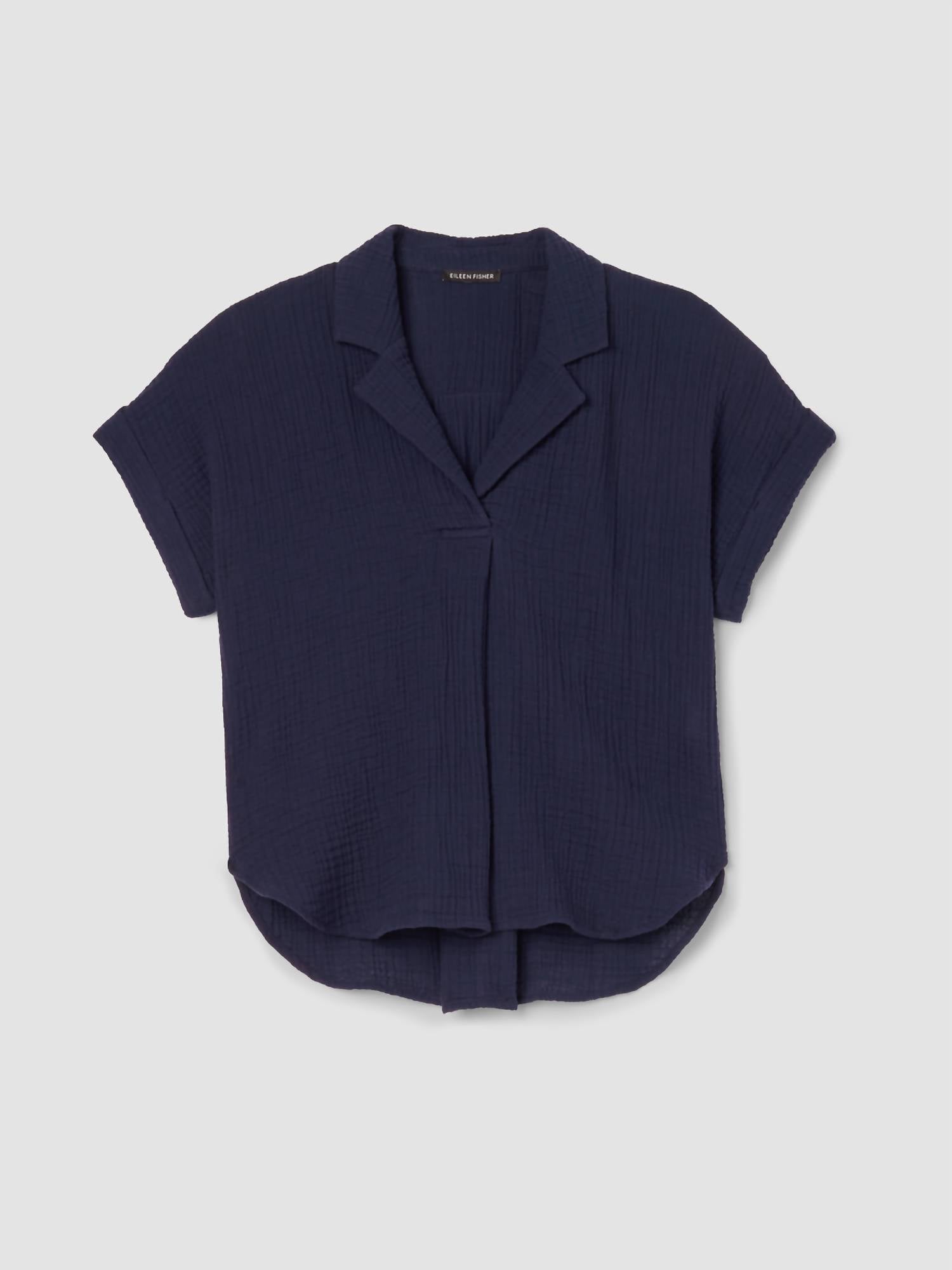 Elevate your spring wardrobe with the Women's Notch Collar Top by Eileen Fisher, crafted in a stylish ink color. This blouse features short sleeves and a textured pattern, perfect for a streetwear-inspired vacation look. Designed with a flattering V-neck and convenient pull-on closure, it seamlessly combines comfort and style. Please note that specific care instructions are not provided.