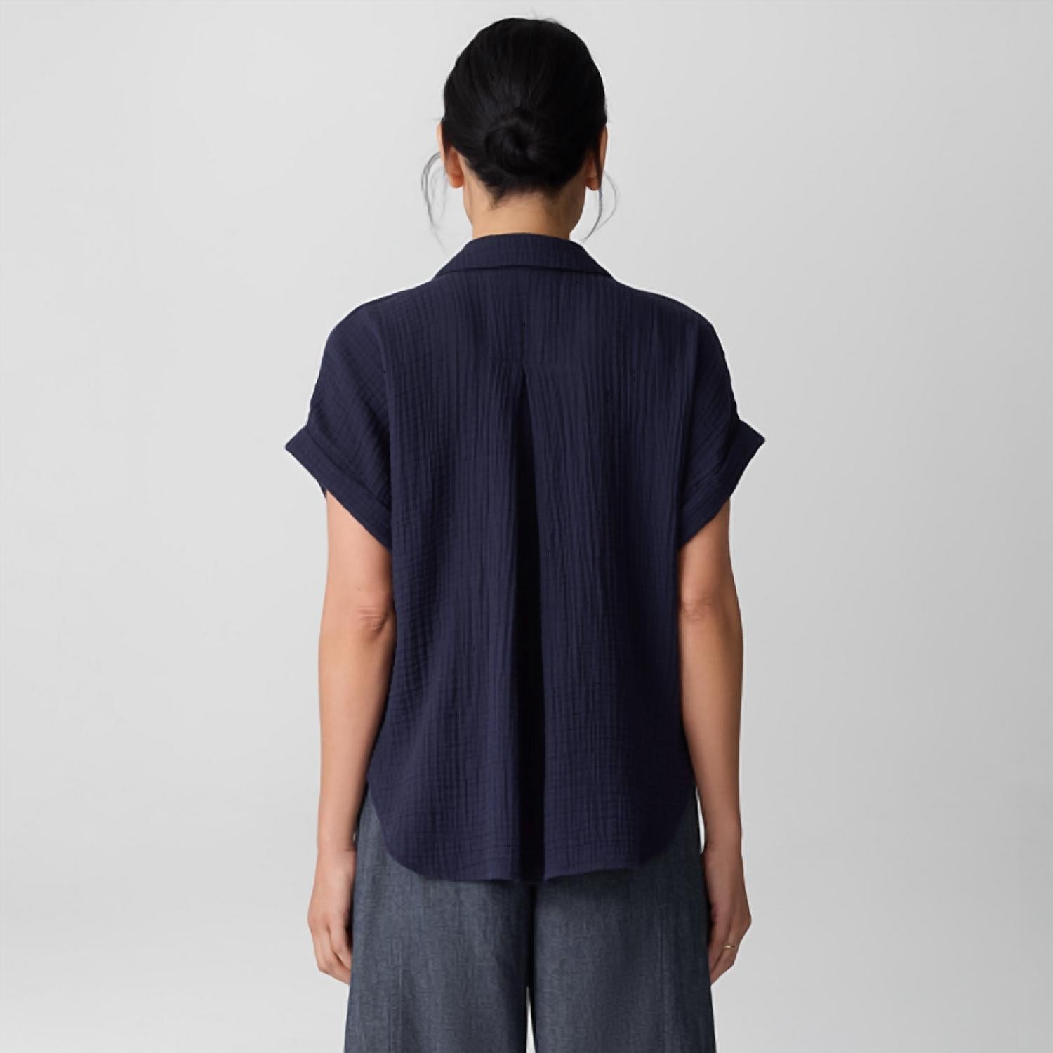 Pair this with your favorite jeans and slides for your next girls night out. Elevate your spring wardrobe with the Women's Notch Collar Top by Eileen Fisher, crafted in a stylish ink color. This blouse features short sleeves and a textured pattern, perfect for a streetwear-inspired vacation look. Designed with a flattering V-neck and convenient pull-on closure, it seamlessly combines comfort and style. Please note that specific care instructions are not provided.