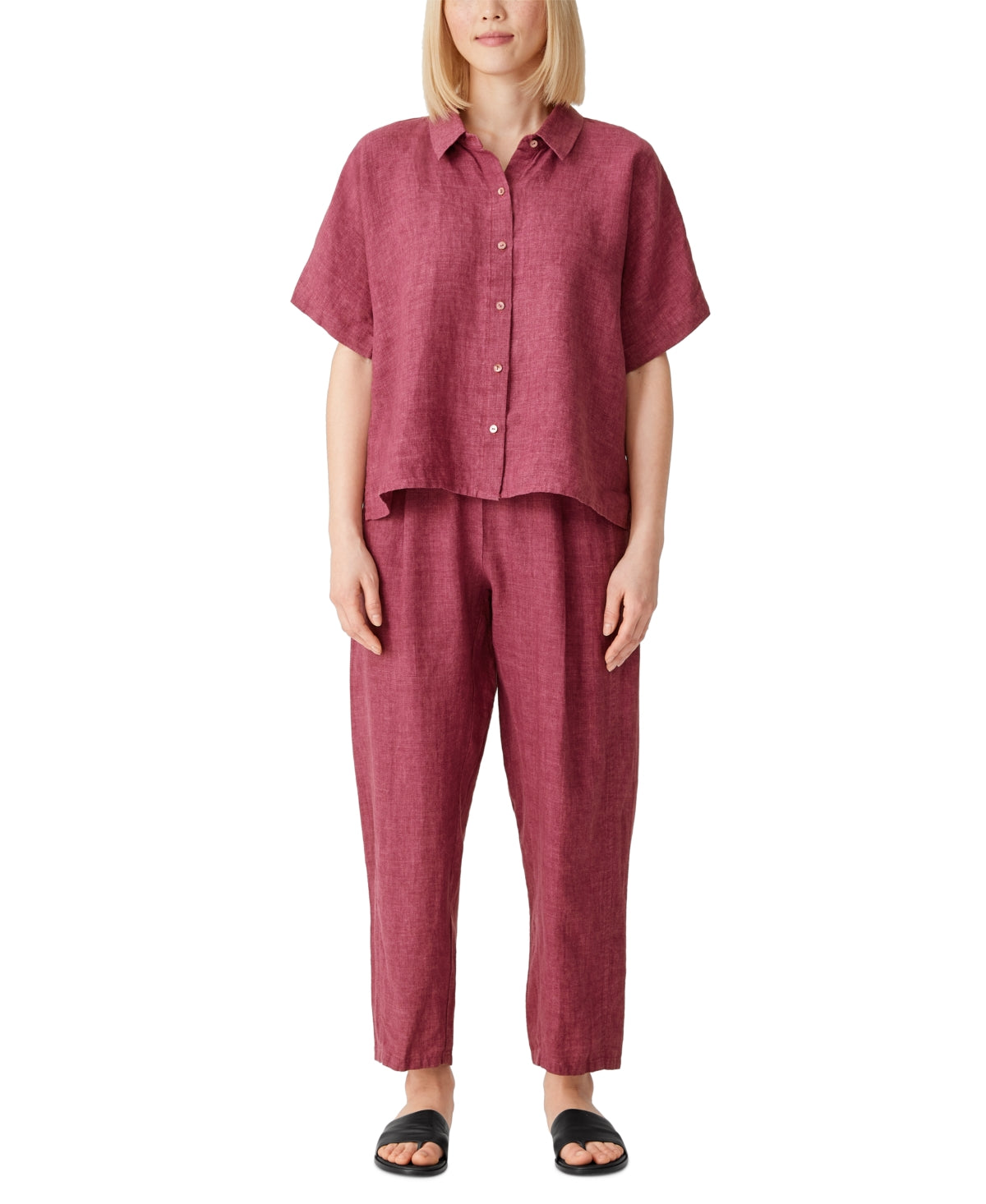 Eileen Fisher adds an essential style to your casual wardrobe with this button-down organic linen shirt.| Approx. 22 long| Point collar; button-front closures| This product contains organic fibers that are certified by Global Organic Textiles Standard| All organic linen| Machine washable| Imported