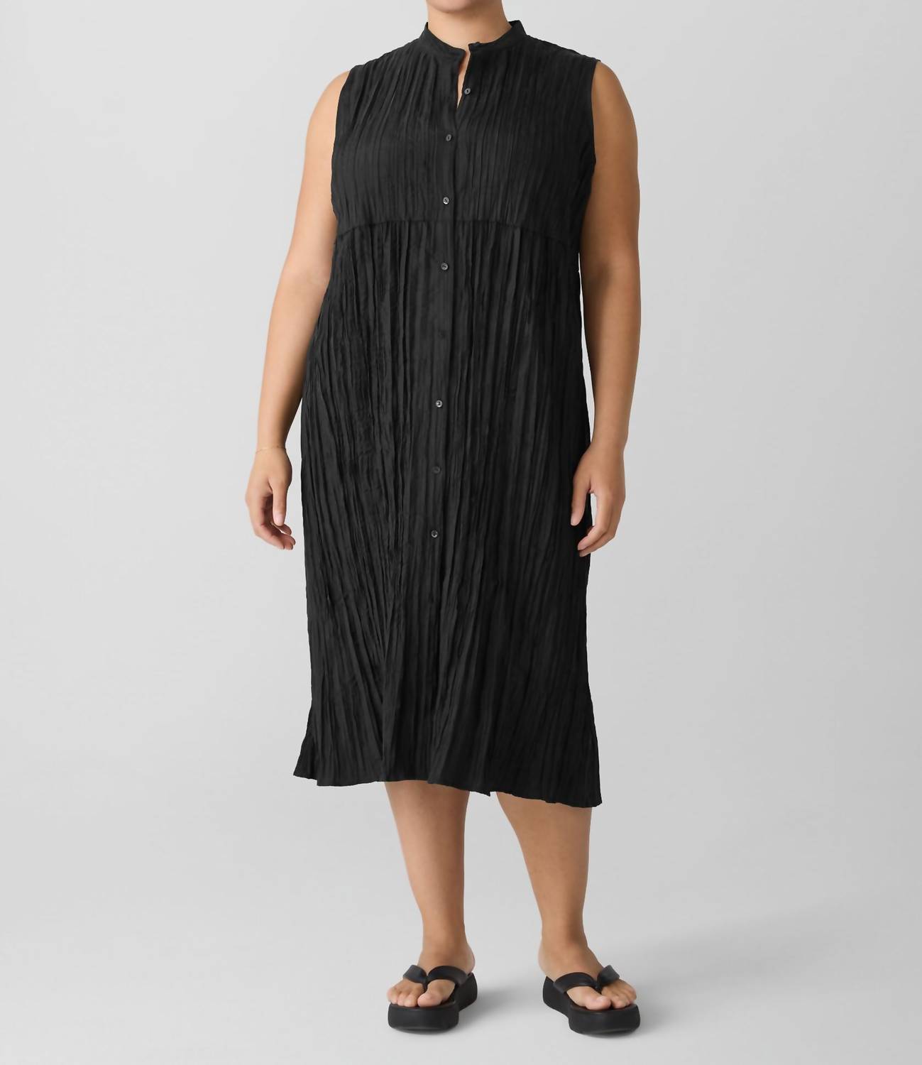 The perfect length dress does exist. Introducing the Women's Sleeveless Dress by Eileen Fisher, a chic and sophisticated choice for your summer wardrobe. This textured black shift dress features a crewneck and offers a sleek silhouette with its midi length. The dress is designed with a convenient button closure, perfect for a vacation-ready look. Embrace the monochrome trend effortlessly with this versatile piece.