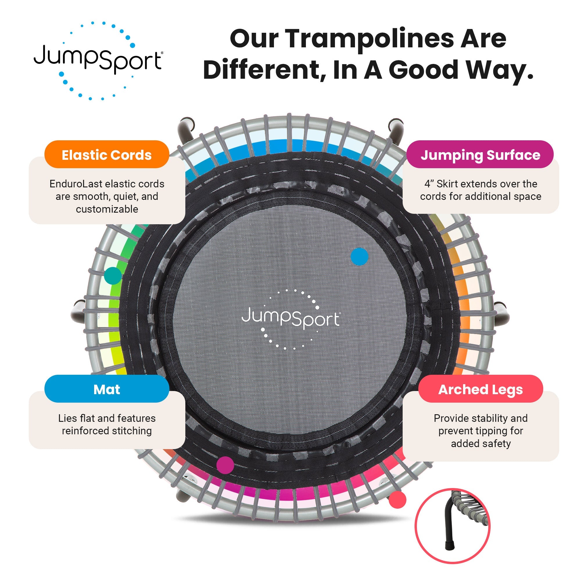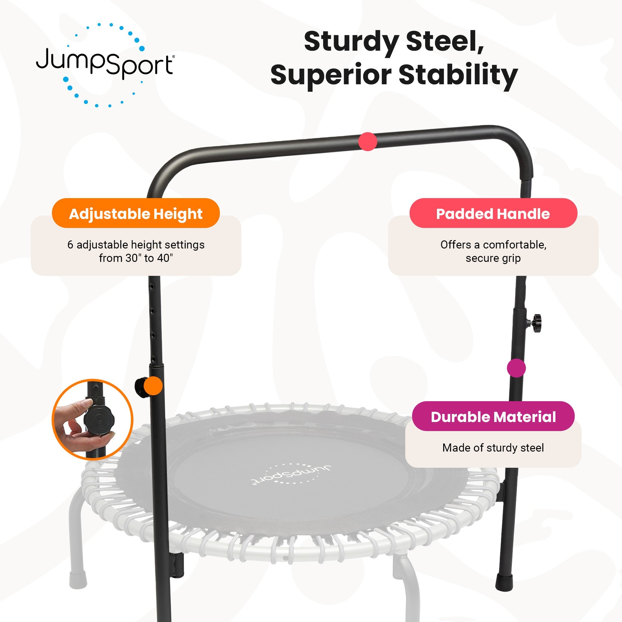 - Bundle includes (1) 39-inch Fitness Trampoline, (1) Adjustable Handlebar, and (1) extended 365-day free trial of JumpSport Fitness TV to jumpstart your workouts