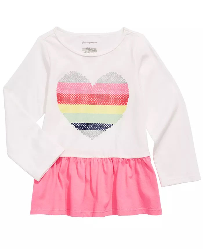 Round neck|Rainbow heart graphic print at front; colorblocked peplum hem|All cotton|Machine washable|Imported