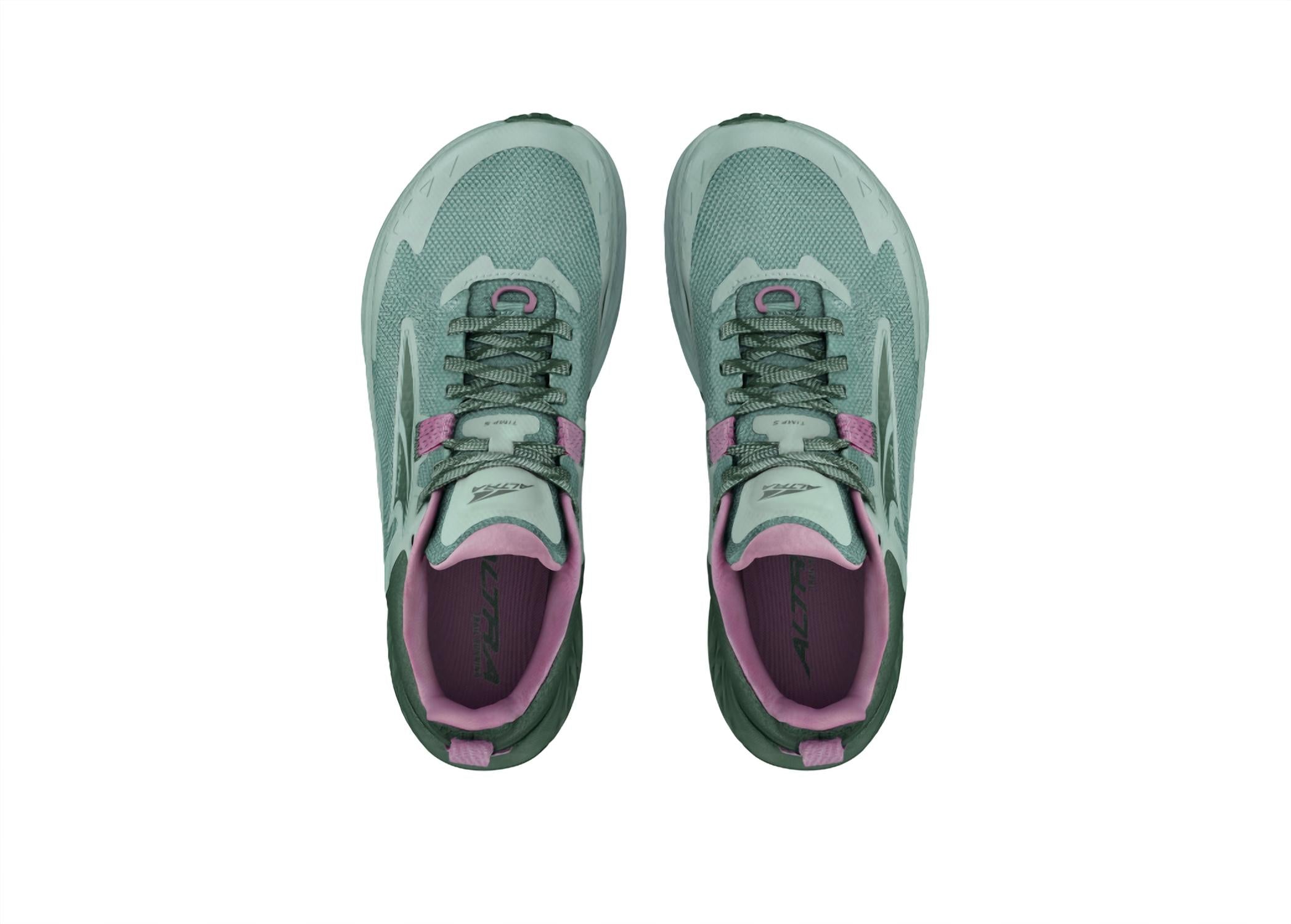 Experience the ultimate in trail running with the Women's Timp 5 Trail Running Shoes by ALTRA. These athletic shoes, in a stylish green/forest color, feature a breathable Quick-Dry Air Mesh upper and Vibram® Megagrip outsole for exceptional traction on varied terrains. The Altra EGO™ MAX midsole provides high cushioning and a touch of extra bounce, weighing in at only 8.6 oz (243 g). Designed with a zero heel-to-toe drop and 29mm stack height, these shoes offer a roomy toe box and standard FootShape™ for natural foot movement during your summer adventures.