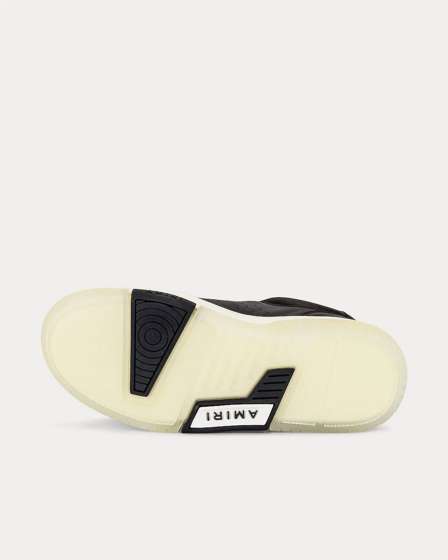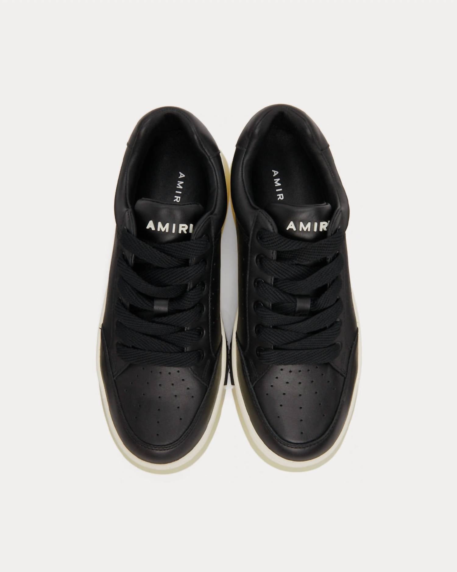 Presenting the Men's Stadium Low Sneakers by Amiri, crafted in black buffed leather for a sleek, monochromatic look. These low-top sneakers showcase perforated detailing and a padded collar for enhanced comfort. They feature a tonal lace-up closure with striking logo hardware in white at the tongue and an embossed silver-tone logo at the heel collar. The shoes rest on a transparent and black logo-embossed treaded outsole with an approx. 2.25" platform, perfect for adding height and style to your holiday party ensemble.