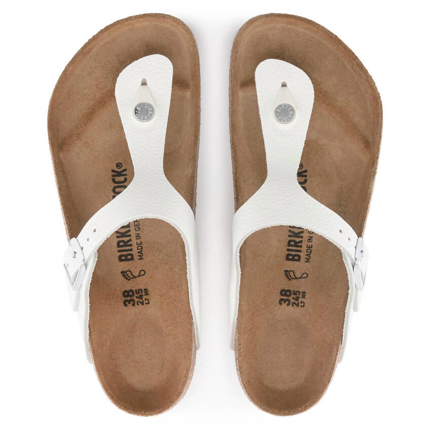 Experience the iconic Women's Gizeh Leather Sandal by BIRKENSTOCK, offering minimalist elegance in a stylish white hue. Made from high-quality natural leather, this sandal showcases an anatomically shaped cork-latex footbed with a suede lining for ultimate comfort. Featuring an open toe design with a flat heel, it includes a thong style and an adjustable metal pin buckle for a personalized fit. This refined and supportive sandal, perfect for spring dinner parties, is proudly "Made in Germany" and features a durable EVA sole.