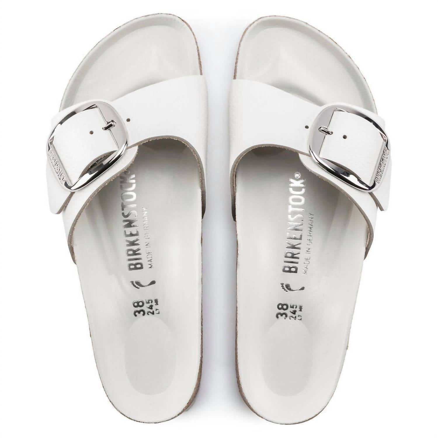 This sandal will take you from brunch to dinner and everything in between. Introducing the Women's Madrid Big Buckle Sandal by BIRKENSTOCK, the epitome of iconic style and comfort. These white sandals feature a contoured cork-latex footbed and an adjustable metal pin buckle for a personalized fit, highlighted by the contrasting natural leather upper and smooth leather lining. With an open toe design and flat heel, these sandals are perfect for a boho chic look on your summer vacation. Made in Germany, their EVA sole ensures durability and comfort for your everyday adventures.