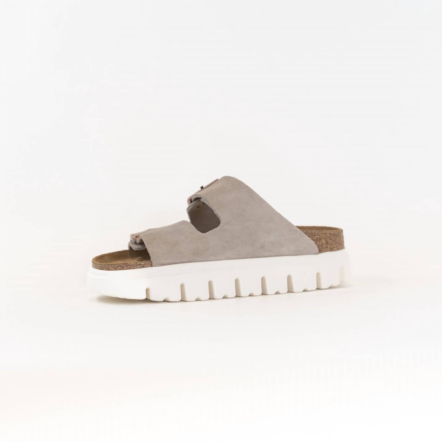 Step into summer style with the Women's Papillo Arizona Platform Sandal by BIRKENSTOCK, available in taupe. This chic sandal features an anatomically shaped cork-latex footbed and a chunky, lightweight EVA platform midsole measuring 30 mm. With an upper made from soft, velvety suede, it boasts double straps with adjustable pin buckles for a personalized fit. Made in Germany, the Arizona Platform is perfect for capturing streetwear trends during vacation outings.