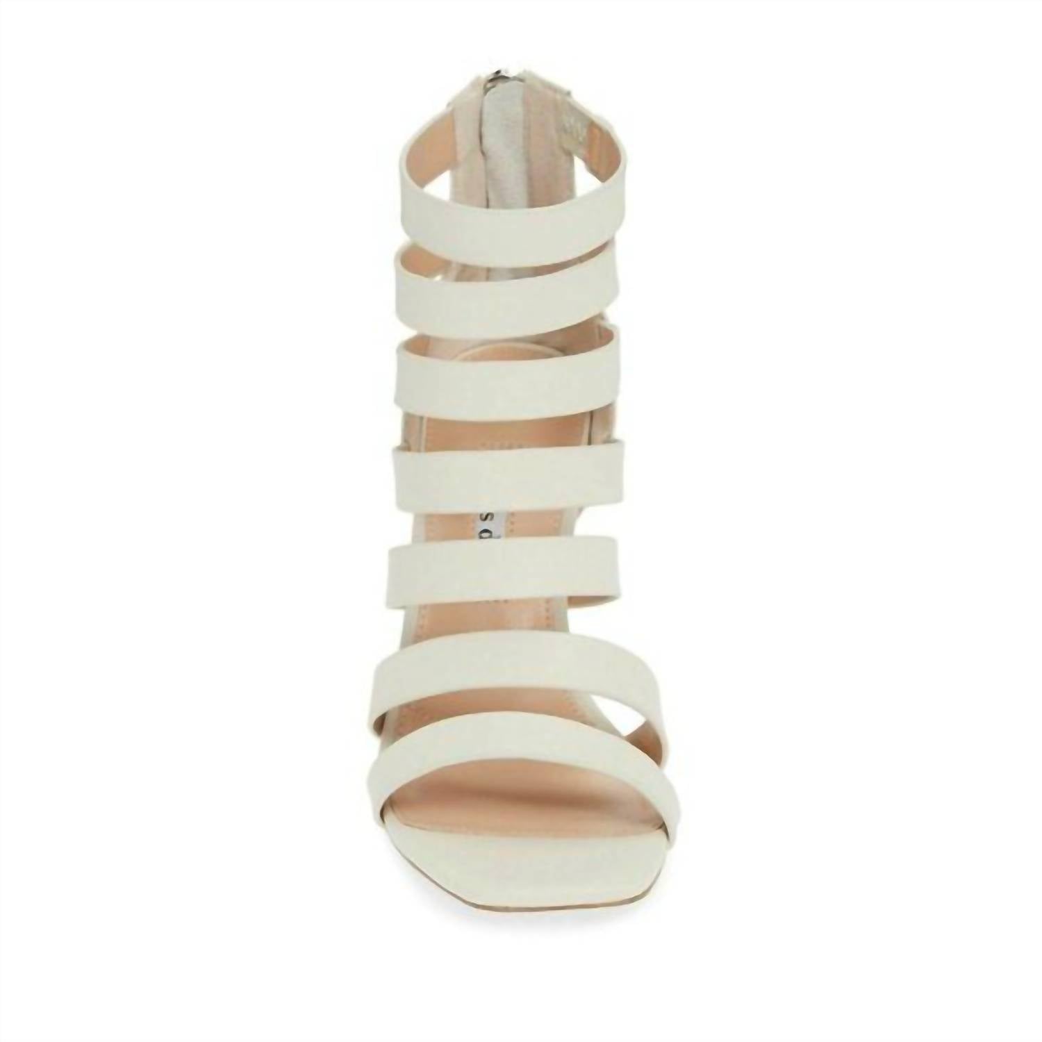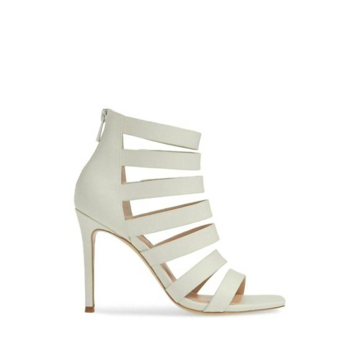 The perfect height for day to night. A fierce sandal is styled with a spiky heel, squared toe and multiple bands for a bold caged look. Sizing: True to size M= standard width Open toe Strappy vamp Back zip closure Lightly padded footbed Slim heel Approx. 4" heel Leather upper, lining and sole