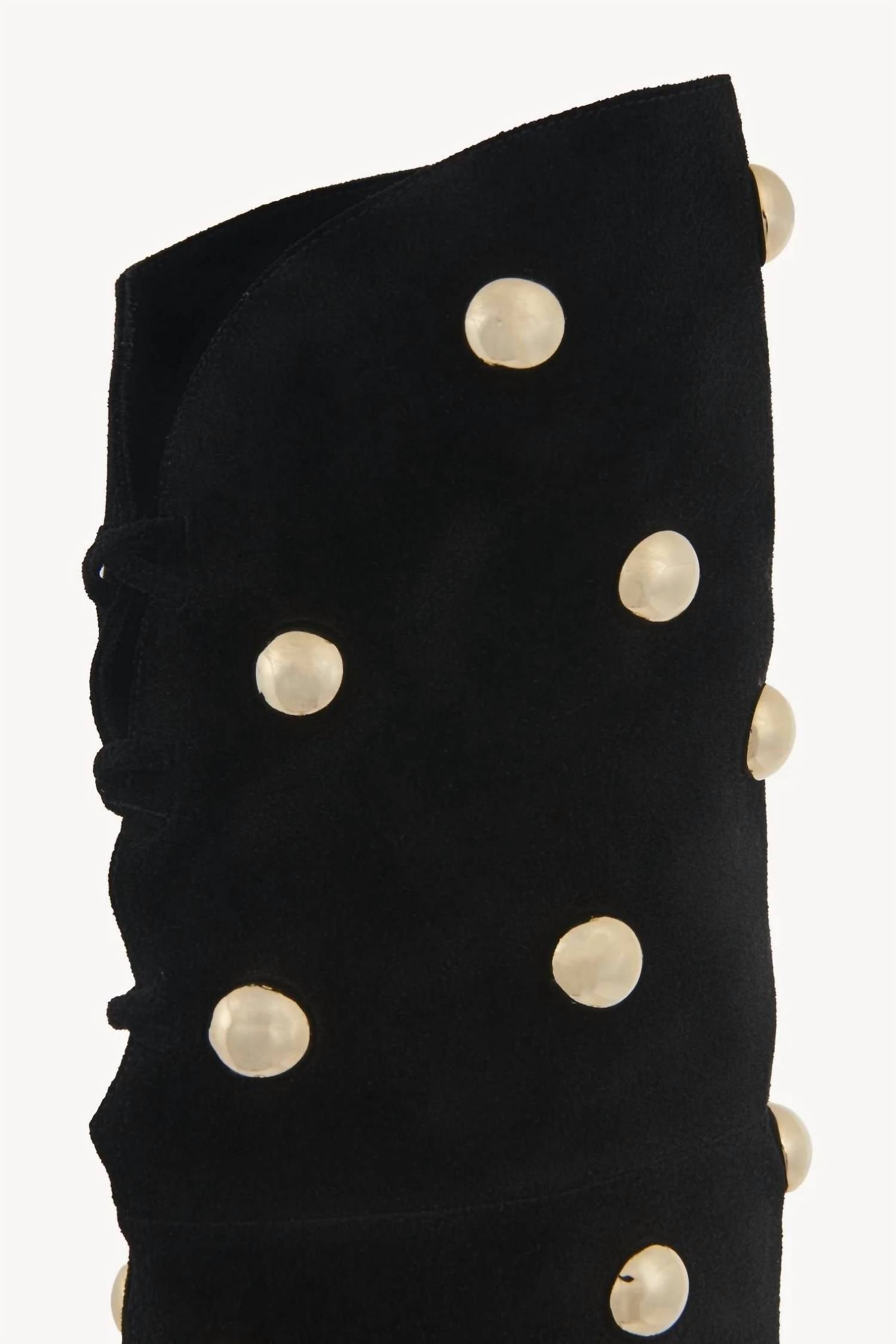 A trend that is here to stay. Introducing the Women's Eve Over The Knee Boot by Chloe, a luxurious choice for the winter season. Crafted from 100% black suede calfskin leather, these boots are accentuated with oversized gold-tone studs for a bold yet sophisticated look. The design includes a lace-up detail at the rear and an 8.5 cm stiletto heel, ensuring both style and comfort with its almond toe shape. Please store your Chloe footwear in the protective dust bags provided and ensure they are filled with tissue to maintain shape when not in use.