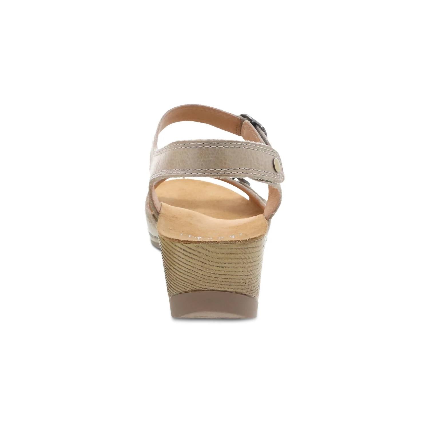 Flowy dresses, cropped pants, and even jumpsuits... this sandal works with them all! Step into style with the Dansko Women's Tricia Sandal in Milled Burnished Linen, perfect for your next dinner party. This boho chic summer sandal combines burnished leather uppers with leather linings for unmatched comfort all day long. Its open toe design features a contoured footbed with memory foam and a shock-absorbing, fully contoured PU midsole for superior support. Enjoy the lightweight durability of its rubber outsole and the convenience of a concealed hook and loop closure.