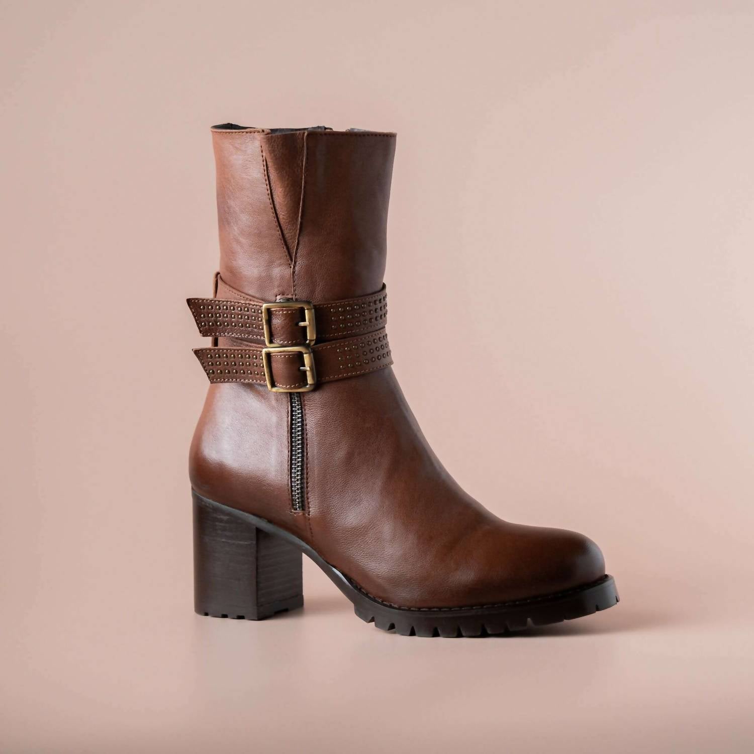 Step up your seasonal footwear game with the Eric Michael Women's Mariska Mid Calf Boots, available in brown for a touch of rustic charm. Made from rich, genuine leather, these boots feature double studded buckles and a round toe design, perfect for travel or streetwear occasions this fall. The mid-height, 2.5-inch block heel provides both style and comfort, while an inside zipper ensures easy on and off. Embrace the versatility of these boots for a fashionable Thanksgiving or any fall outing.
