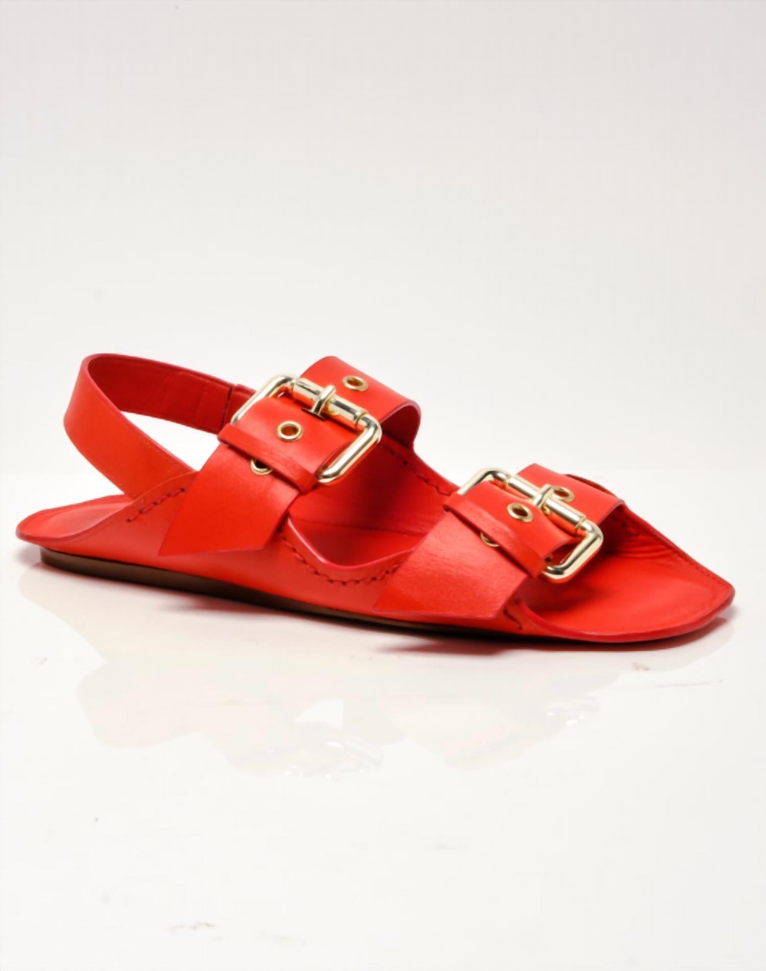 Introducing the Women's Blossom Buckle Sandal by Free People, a chic addition to your summer wardrobe. Crafted from leather, these sandals feature a sleek flat heel and a unique double buckle design. Enjoy the open toe style and convenient sling back strap, ideal for pairing with jeans or shorts.