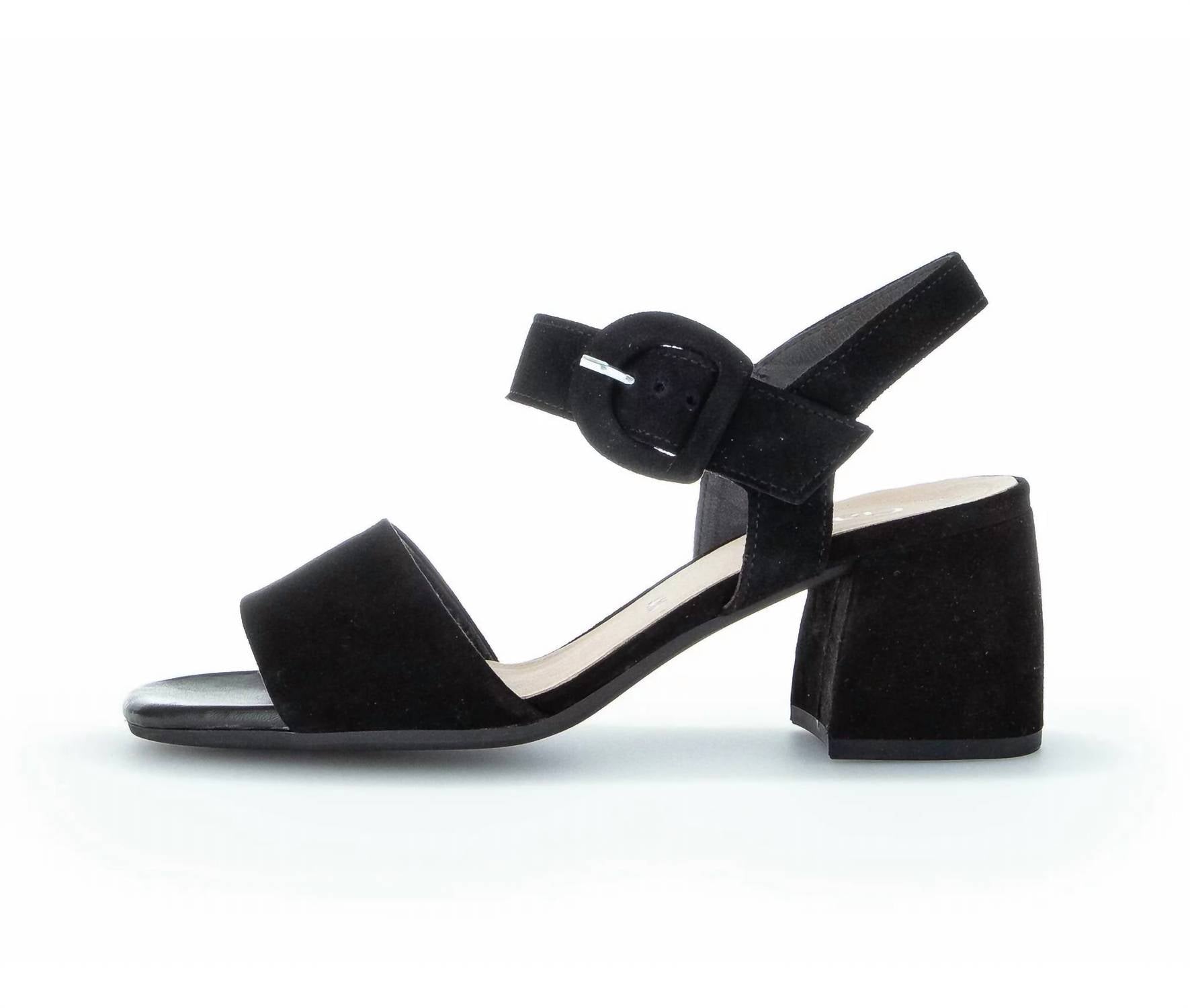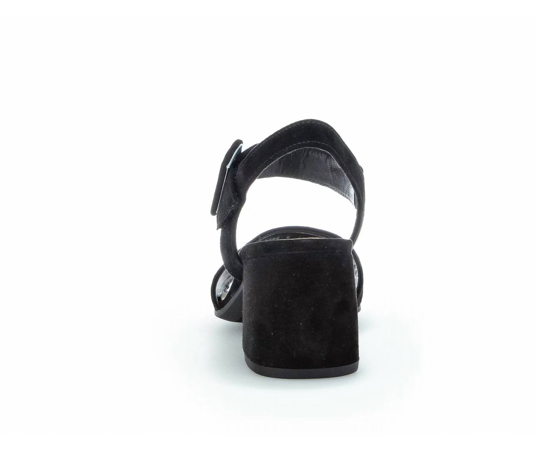 Flowy dresses, cropped pants, and even jumpsuits... this sandal works with them all! Step into elegance with the Women's 81.710.17 Heel Sandal by Gabor, a sophisticated addition to any wardrobe. Crafted in timeless black, these sandals feature a stylish block heel with a height of 6.5 cm for a comfortable lift. The upper is made from luxurious suede, complemented by a leather lining, all designed with a convenient Velcro closure. Perfect for spring engagements or any occasion where quiet luxury is desired, these sandals define understated elegance.
