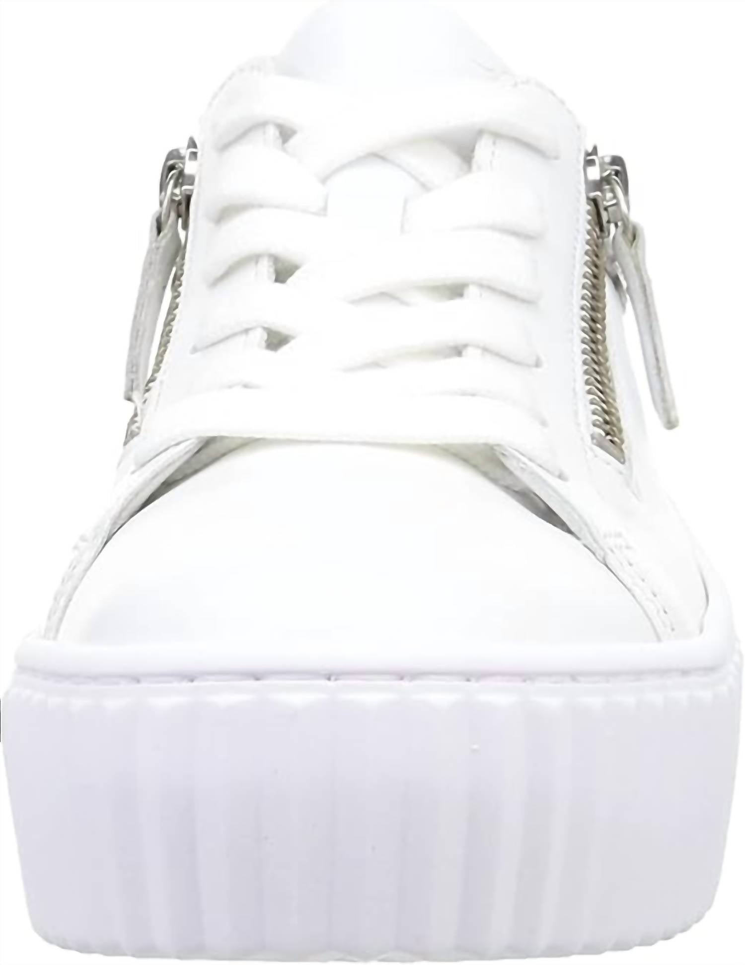 Cute, functional, and comfortable. These sneakers check all the boxes. Introducing the Women's Gabor Sneaker in crisp white leather, expertly crafted for both style and functionality. This sneaker features a convenient combination of laces and zipper closure, and an approximately 1" platform heel for a modern touch. Its round toe design enhances comfort, while the removable footbed allows for personalized orthotic use. A perfect choice for those seeking both fashion and custom fit in their everyday footwear.