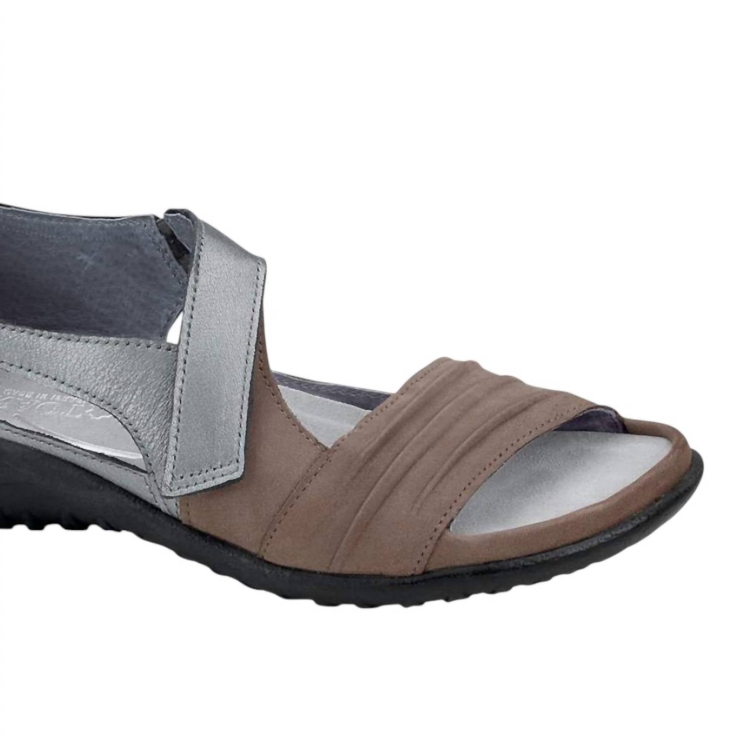 Classicly cute and all-day-wearable. We love this sandal. Introducing the Naot Women’s Papaki Leather Sandal in Shitake Nubuck Sterling, a perfect choice for stylish comfort. This sandal features a padded front strap with a contrasting rouched design, and a padded heel cup with a hook and loop closure for a secure fit. Crafted with a removable anatomic cork and latex footbed wrapped in suede, it molds to your foot over time, while the lightweight 1" polyurethane sole provides durability and slip resistance. With APMA acceptance for promoting good foot health, this sandal is orthotic friendly and suits a minimalist summer style.