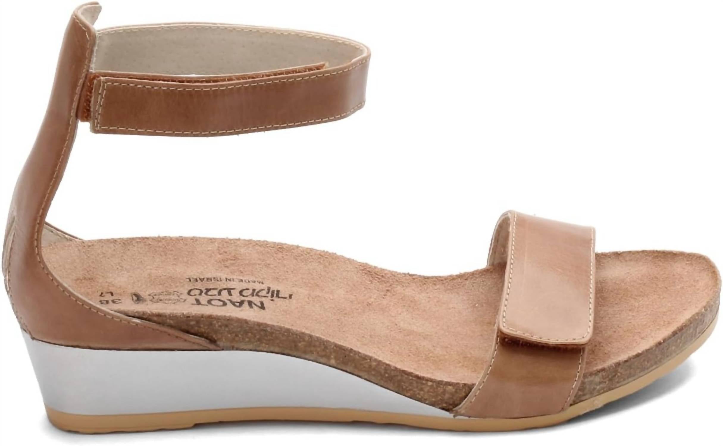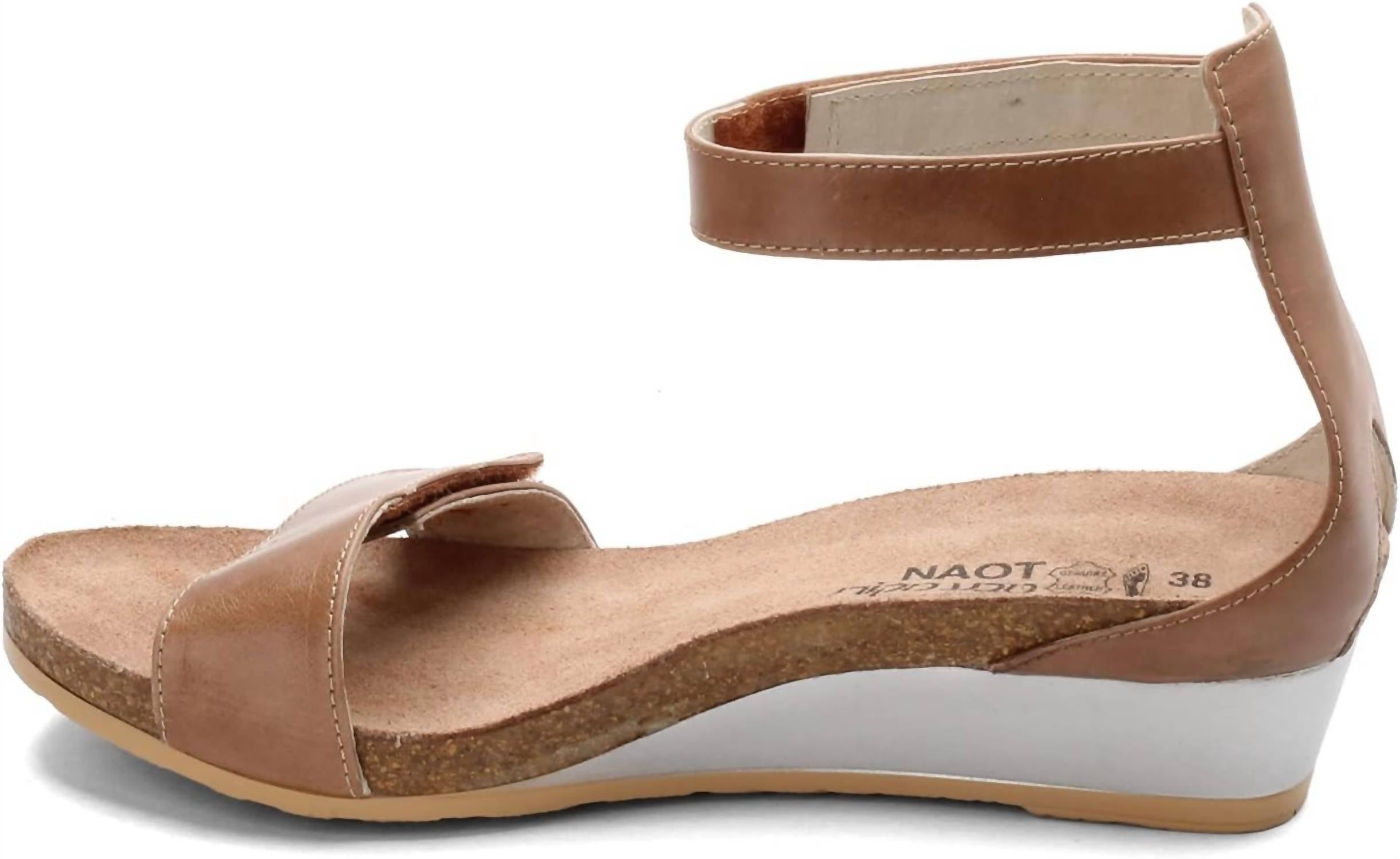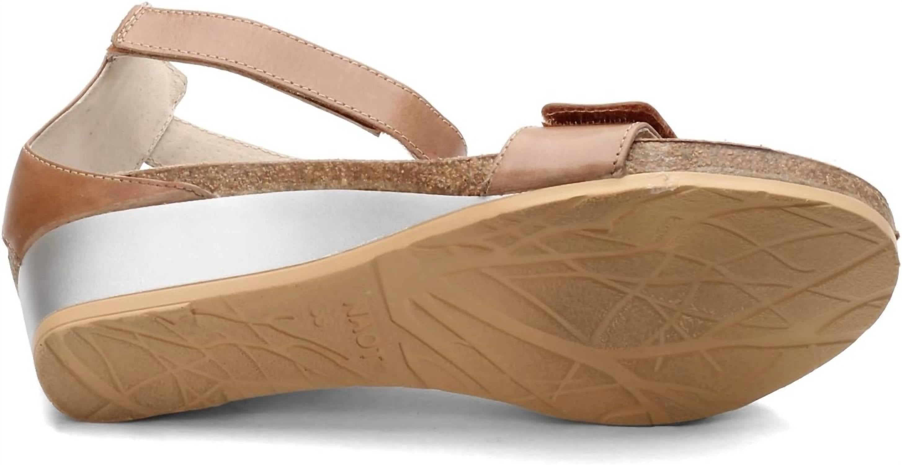 This sandal will take you from brunch to dinner and everything in between. Introducing the NAOT Women's Mermaid Sandal in Arizona Tan Leather, an elegant choice for any occasion with its full adjustability and minimalist design. Made from high-quality leather, this sandal features an open toe and a chic 1.75” wedge heel perfect for a summer dinner party. With a polyurethane sole and medium width, it ensures comfort without compromising style. Note that it fits true to size, though half sizes should size up for the best fit.
