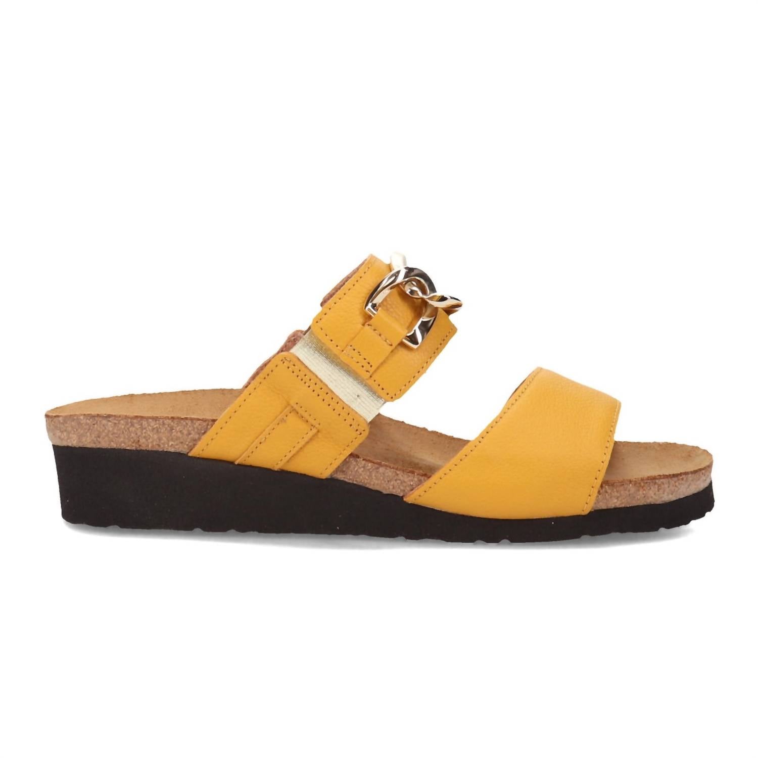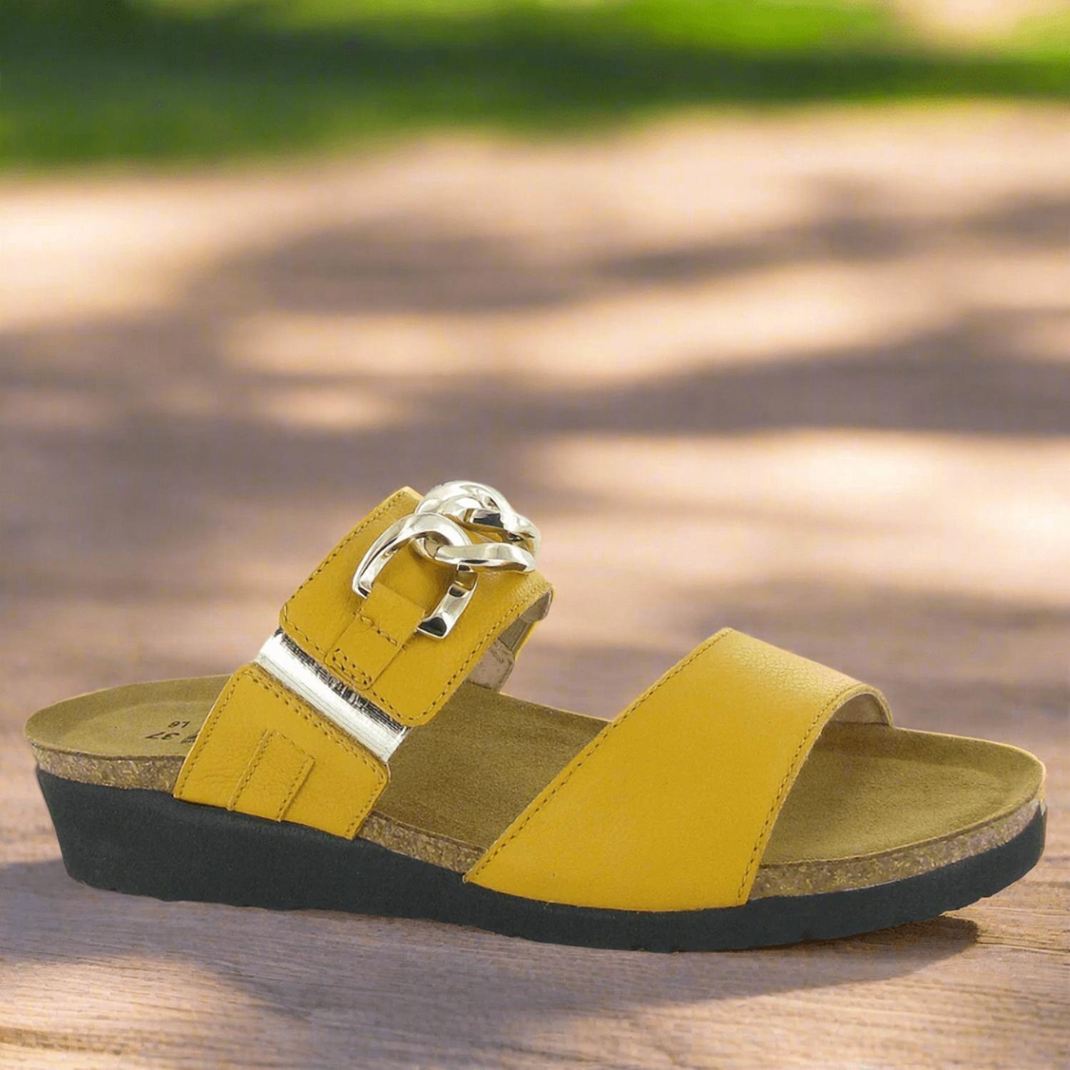 This sandal will take you from brunch to dinner and everything in between. Step into the ultimate vacation comfort with the Women's Victoria Leather Slide by NAOT, a summer sandal designed for day-to-night versatility. These sandals showcase an open toe and a bold chain accent, embodying a maximalist trend in marigold color. The insole features Naot's anatomic cork and latex footbed wrapped in suede, molding to your foot's unique shape, supported by a 1.5" heel and a 0.5" platform. Sole composition is EVA, accepted by the American Podiatric Medical Association for good foot health.
