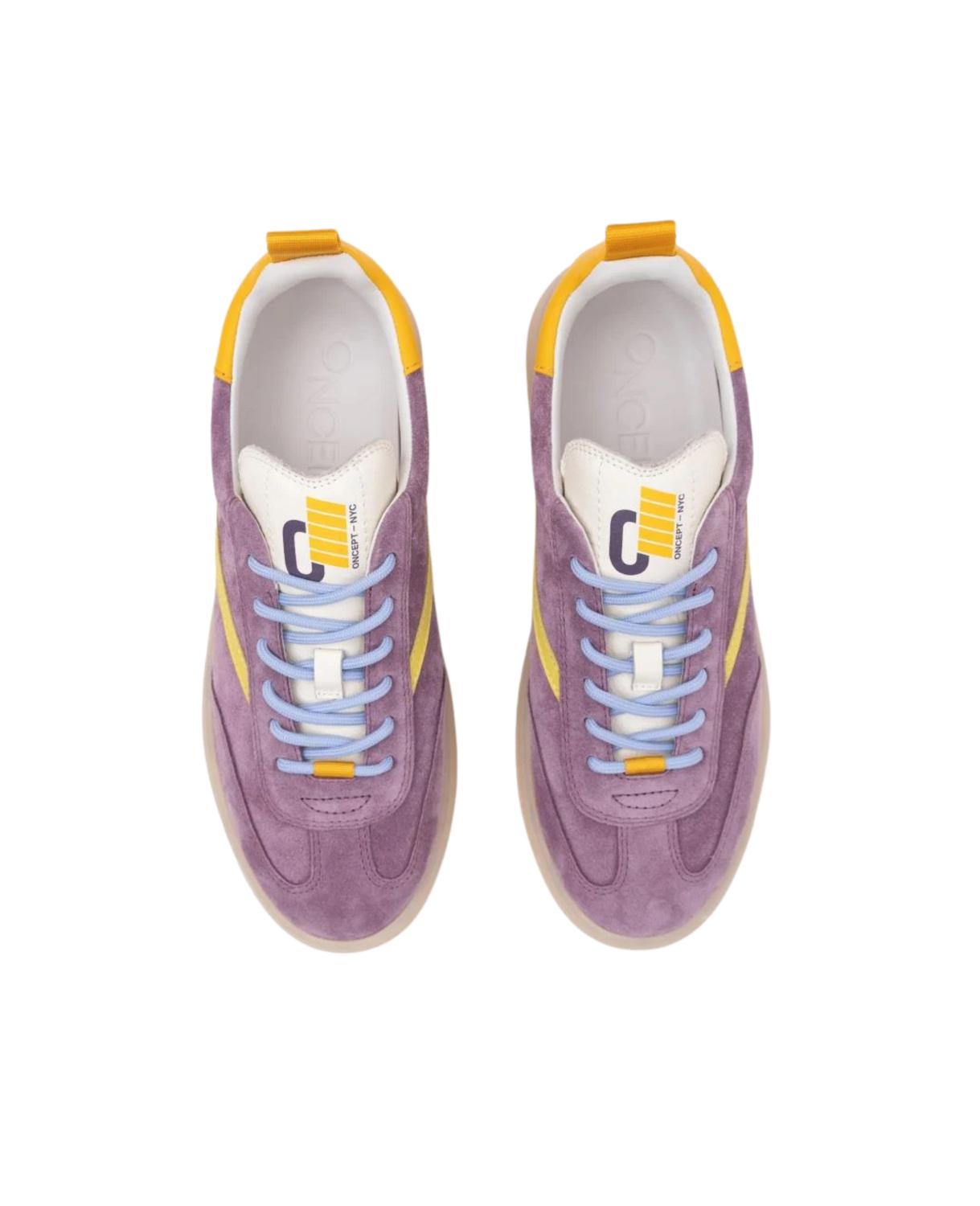 Get your daily steps in with these adorable sneakers. Introducing the Women's Crushed Panama Sneaker by Oncept, a stylish choice for your spring streetwear wardrobe. These low-top sneakers feature a luxurious combination of ultra-soft luxe leather and tencel pulp-based twill lining, complemented by Re-nylon spiral laces and a leather sock for ultimate comfort. The round toe design offers a comfortable fit, and the platform heel ensures enduring style. Designed for the savvy traveler, they're perfect for vacation wear in a vibrant grape hue, boasting a molded footbed made with recycled materials and re-speckled bottoms.