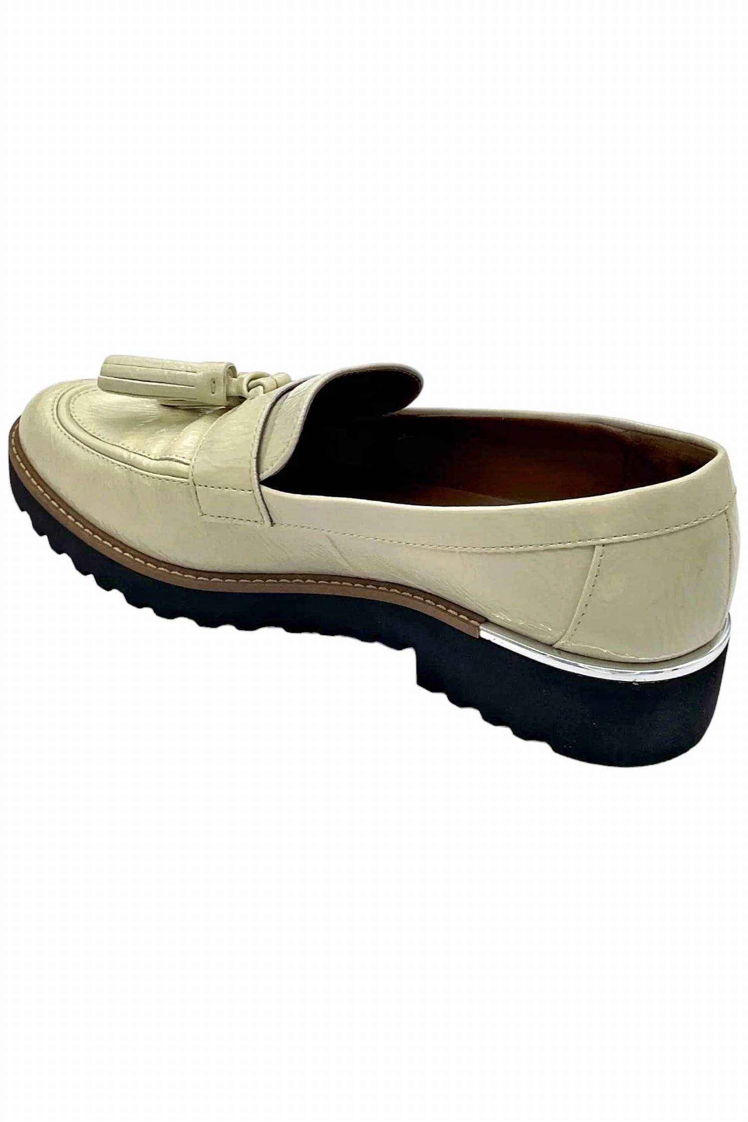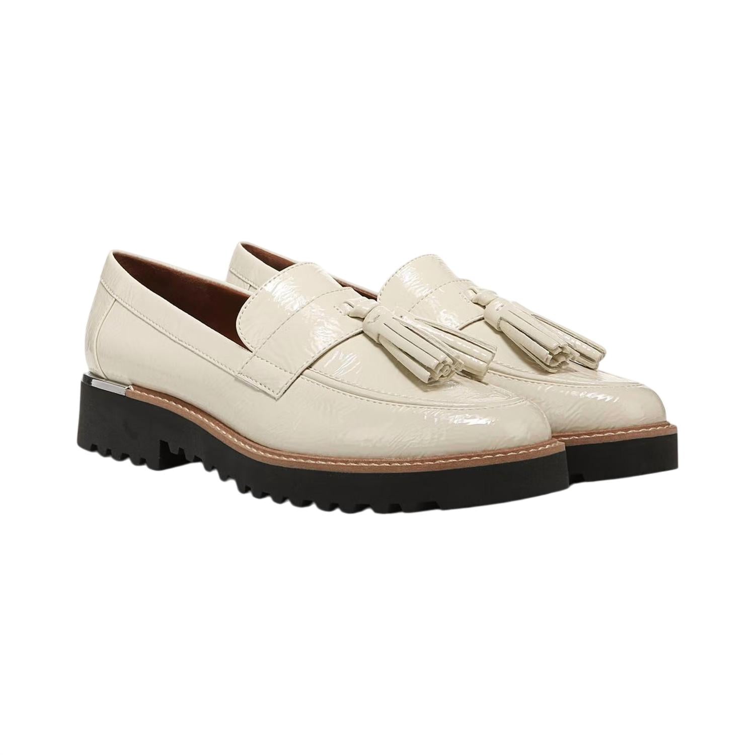 A classic loafer that is both comfortable and polished. Elevate your preppy spring wardrobe with the Women's Carolynn Tassel Lug Sole Loafer from Franco Sarto in a chic putty shade. These loafers feature a faux patent leather upper with a stylish strap and tassel detail, complemented by a sturdy lug sole. They are true to size and have a comfortable 1.5-inch heel height, perfect for holiday parties. Made from man-made materials, these loafers offer a contemporary round toe shape for a polished look.