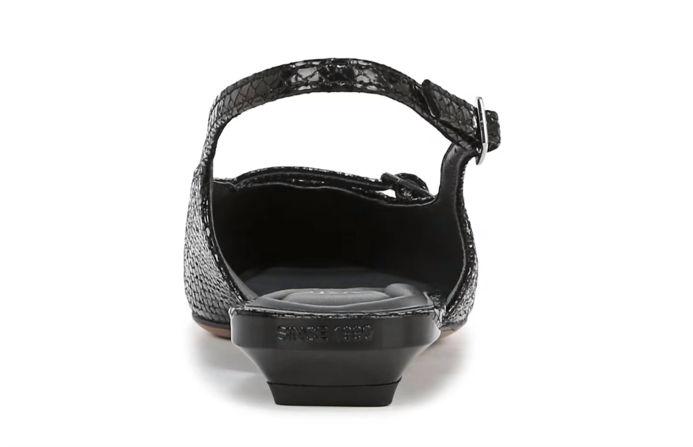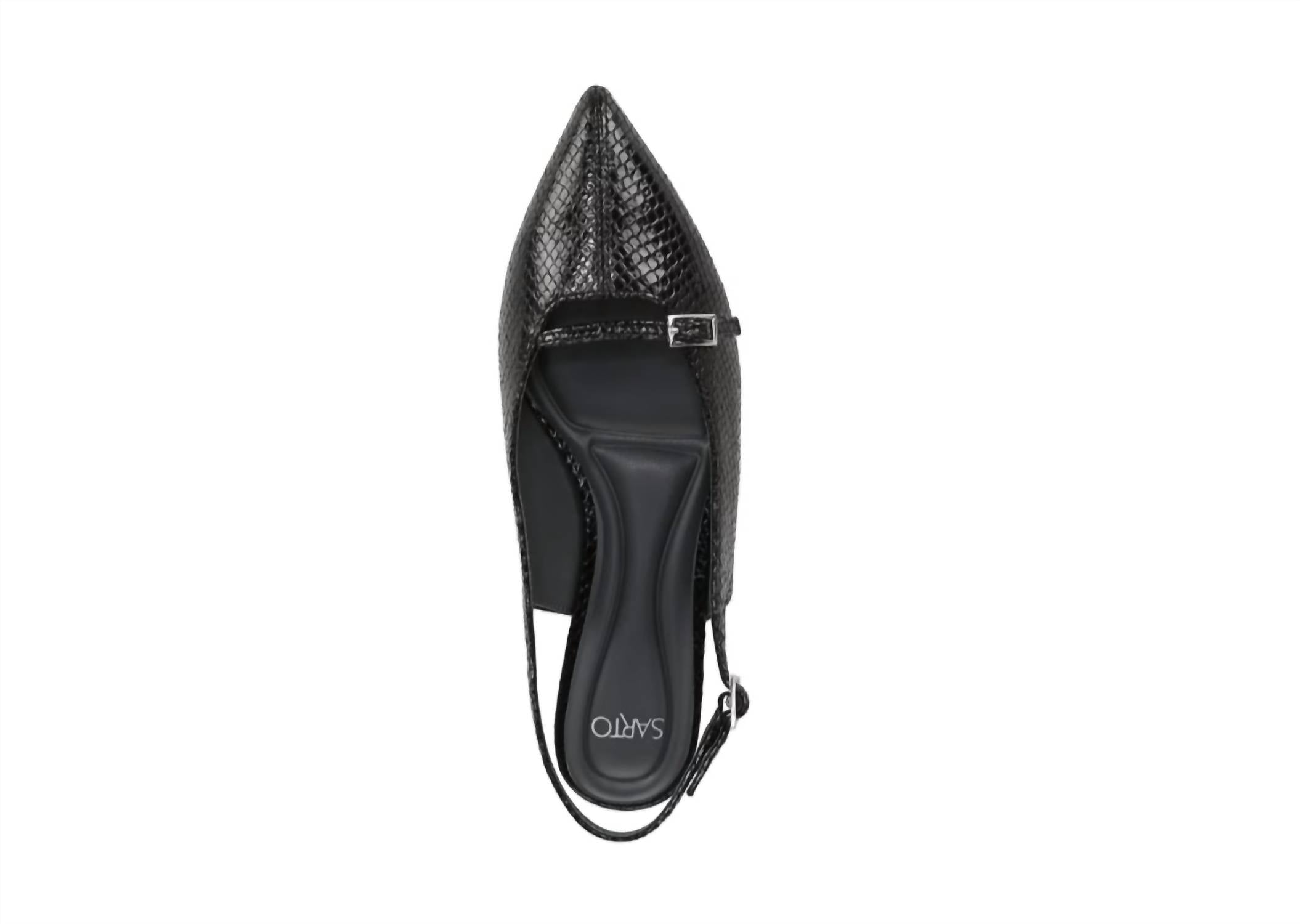 A preppy yet feminine take on the classic loafer. Discover the Franco Sarto Women's Emma Mary Jane Slingback Flats, a fusion of statement style and sophistication perfect for your next evening event. Finished in Black Snake leather, responsibly sourced through the Leather Working Group, these flats feature a timeless pointed toe and a comfortable .6 inch block heel. Designed with a convenient slingback buckle closure, they offer effortless elegance, allowing for a seamless transition from day to night. Ideal for summer, these shoes are the epitome of quiet luxury and modern fashion.