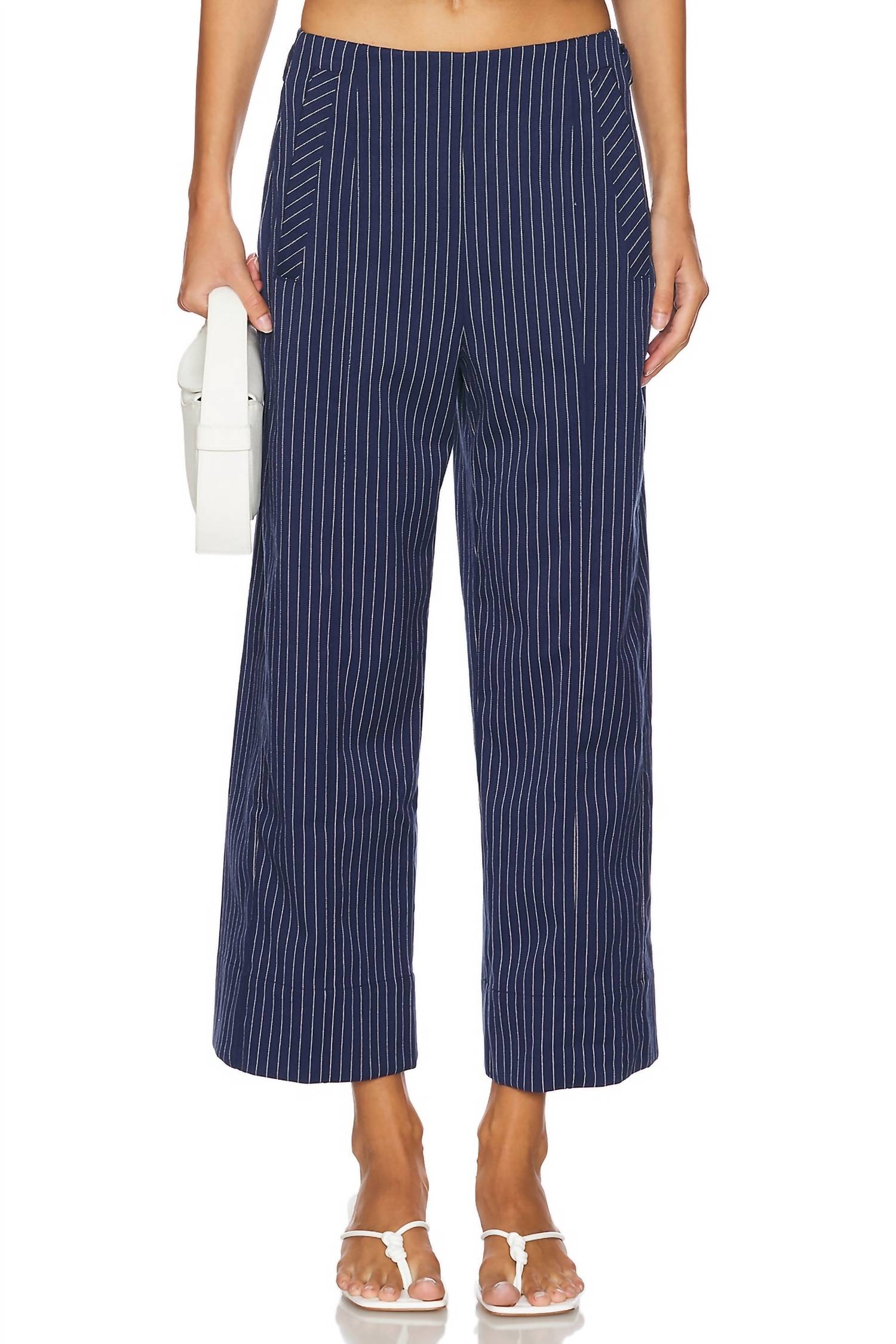 Enhance your wardrobe with this trendy cropped number, designed to blend style and practicality. The comfortable fit allows for easy all-day wear. The perfect length to pair with your favorite mules. Discover the Acadia Trousers Pants by Free People, offering a blend of timeless style and modern chic. These trousers feature a high-rise fit with a subtly tapered silhouette, characterized by a classic pinstripe pattern and cropped inseam. Equipped with an invisible side zip closure and welt pockets, they make a versatile addition to any wardrobe. Perfect for pairing with loafers or kitten heels, these blue trousers ensure effortless elegance for any occasion. Care: Hand wash and lay flat to dry.