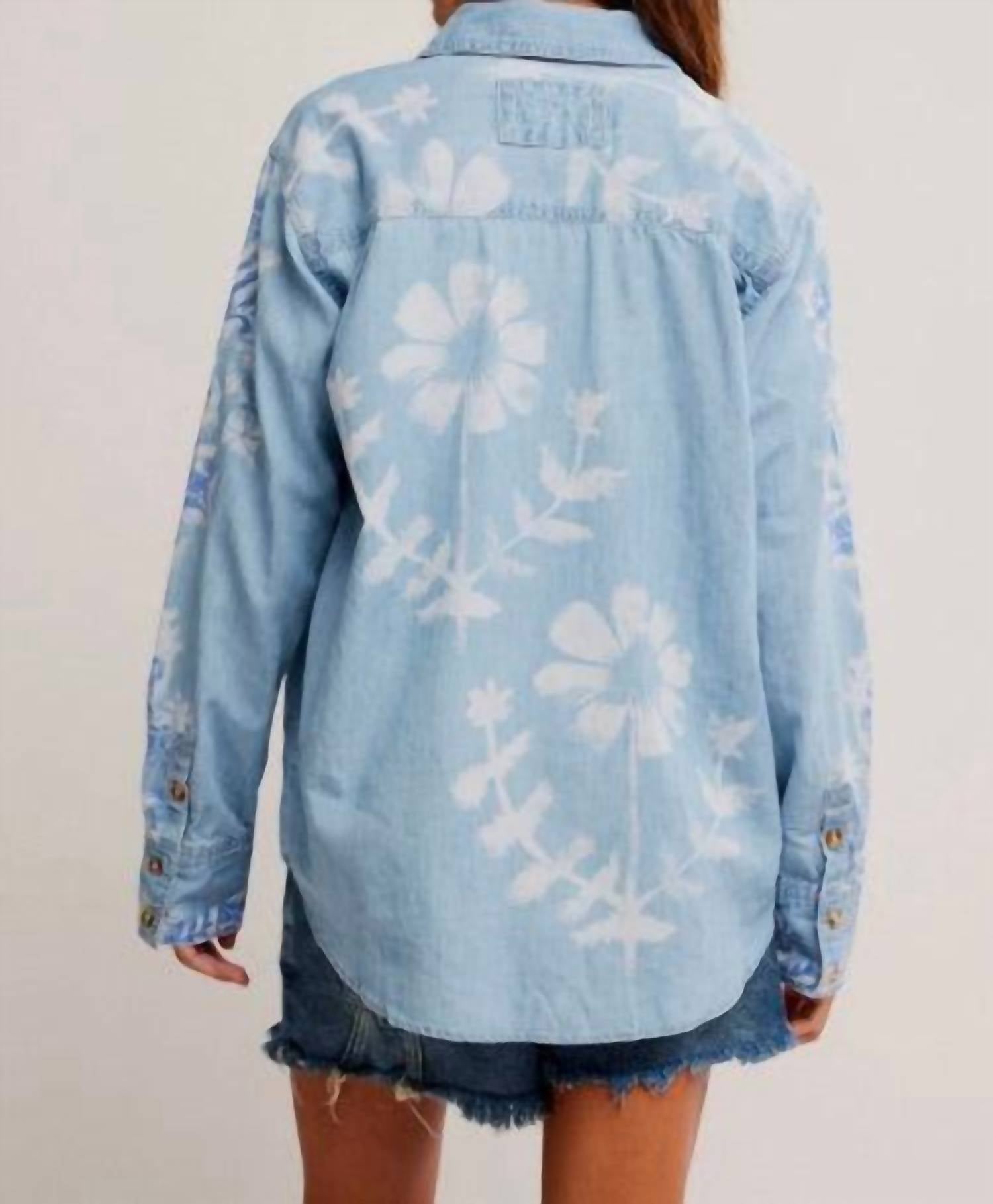 Perfectly tailored and soft to the touch. Introducing the Airbrushed Denim Top by Free People, an essential piece for your spring streetwear collection. This long sleeve button-down is crafted with 100% cotton, offering both comfort and style in a relaxed fit. Made with care as an imported piece, it features a collared neckline and delightful patterned denim, perfect for Mother's Day or back-to-school occasions. To maintain its premium quality, follow the care instruction: hand wash only. Model is wearing a size small, true to size.