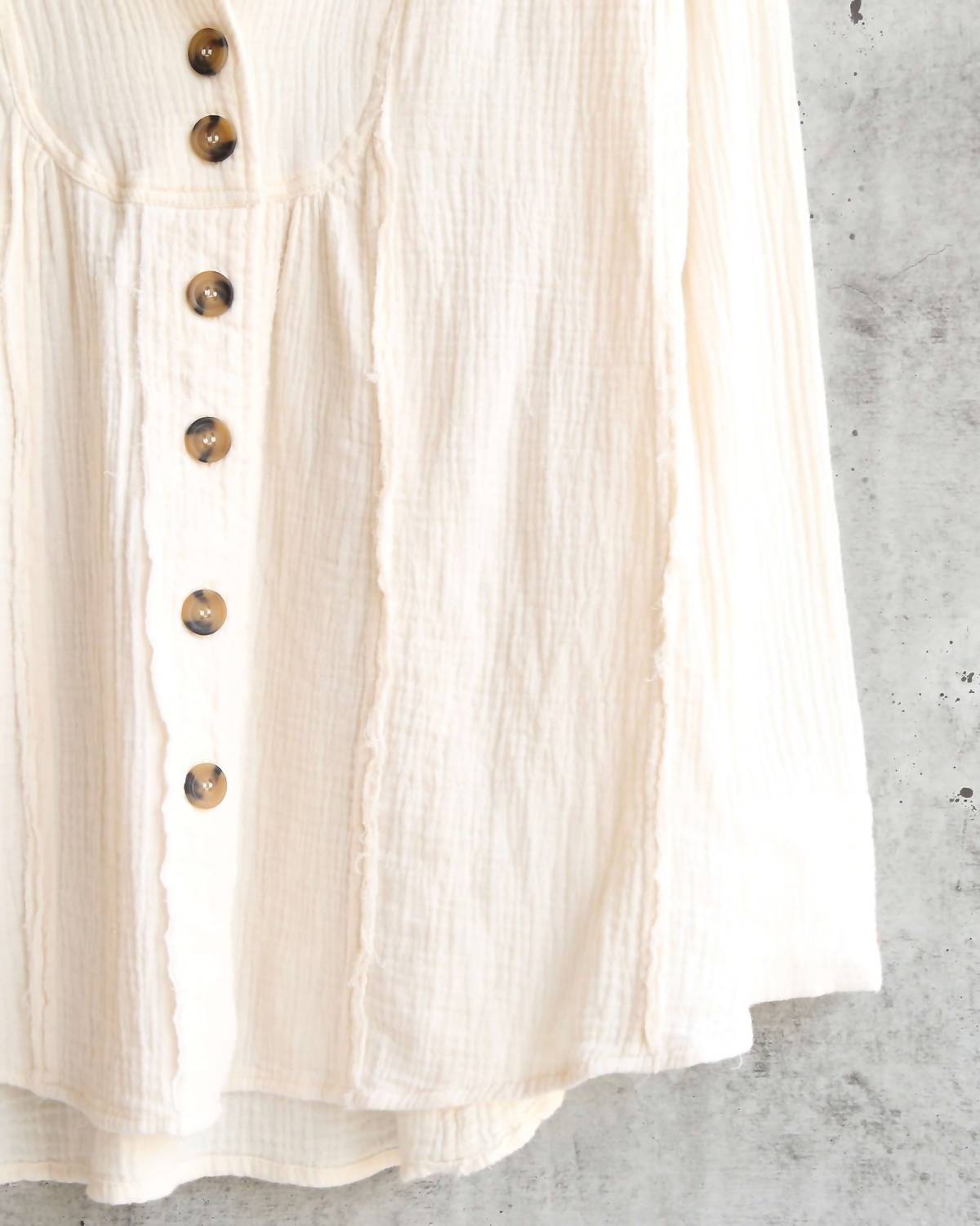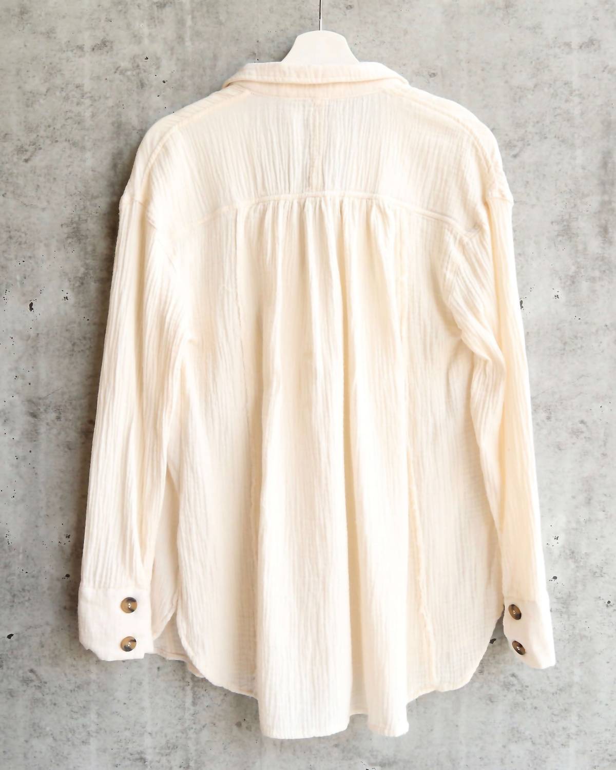 This button down shirt is comfortable yet polished. Introducing the All About The Feels Top by Free People, a timeless addition to your wardrobe in classic white. This long-sleeve button-down shirt features a sophisticated V-neck design, perfect for the fall season and suitable for workwear occasions. Crafted from 100% cotton, it offers comfort with a stylish simplicity, ideal for church or special gatherings. Closure: Button closure.
