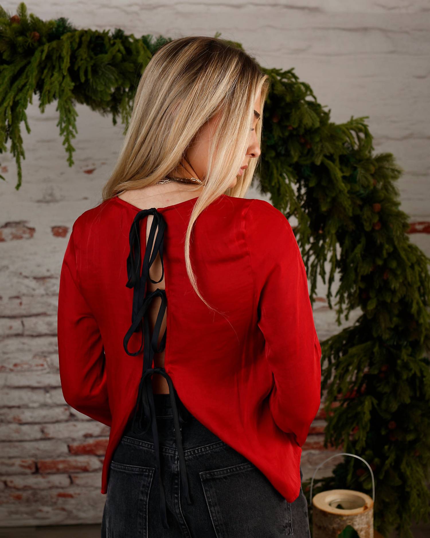 Pair this with your favorite jeans and slides for your next girls night out. Elevate your wardrobe with the Arabella Satin Tie Back Top by Free People, a chic red blouse featuring long fluted sleeves for a sophisticated look. This stylish piece is crafted from 100% polyester and boasts a jewel neck. It secures elegantly with a trio of dainty black ties at the neck and back. Care is effortless with machine wash and line dry instructions. Model Kayley is 5'7", weighs 118 lbs, with a 30" chest, 24" waist, and 35" hip, wearing size small.