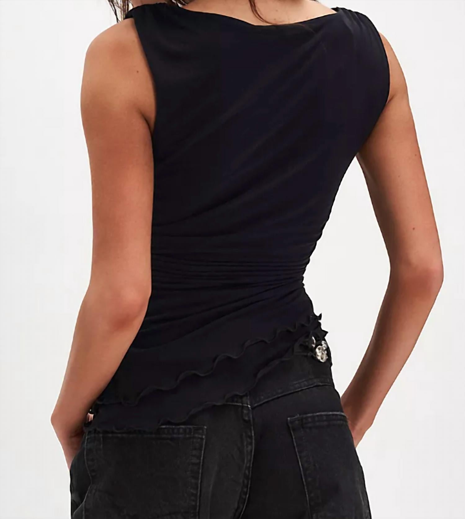 Pair this with your favorite jeans and slides for your next girls night out. Elevate your wardrobe with the Ash Knit Top by Free People, a stylish black sleeveless essential. Crafted from 100% polyester, this top showcases a boatneck design, dropped armholes, and a unique asymmetrical hem with a layered lettuce-edge finish. Perfectly versatile, it features a slim fit with ruched side detailing for a flattering silhouette. Closure is pull-on, and it's easy to care for with machine wash cold instructions.