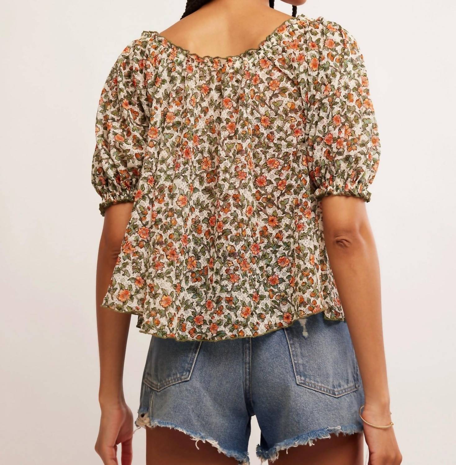 A versatile blouse that works from desk to dinner! Elevate your spring wardrobe with the Astra Peasant Top by Free People in the charming Daisy Combo. This blouse showcases short puffy sleeves and a hip-length silhouette, crafted from a sheer floral print with playful puffed sleeves, perfect for concerts or Easter occasions. It features a button closure and a square neckline, adding a touch of contrast trim and gathered detail for added dimension. This streetwear-inspired piece is best maintained by hand washing.