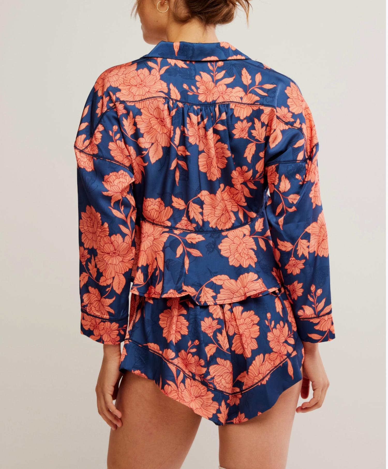 A set so cute you'll never want to take it off. Designed to look good while lounging, this little number is the perfect outfit for hanging at home in style. Elevate your downtime with the Beauty Sleep PJ Set by Free People, an essential for relaxed luxury in cerulean with a floral pattern. The long-sleeve top features a collared V-neckline, empire waist, peplum detail, and button-front closure, while the breezy shorts offer an elastic waistband and pull-on style. Made with silky fabric, this loungewear set is designed for both comfort and style, perfect for a self-care day or vacation. Ideal for the summer season, this set celebrates quiet luxury.