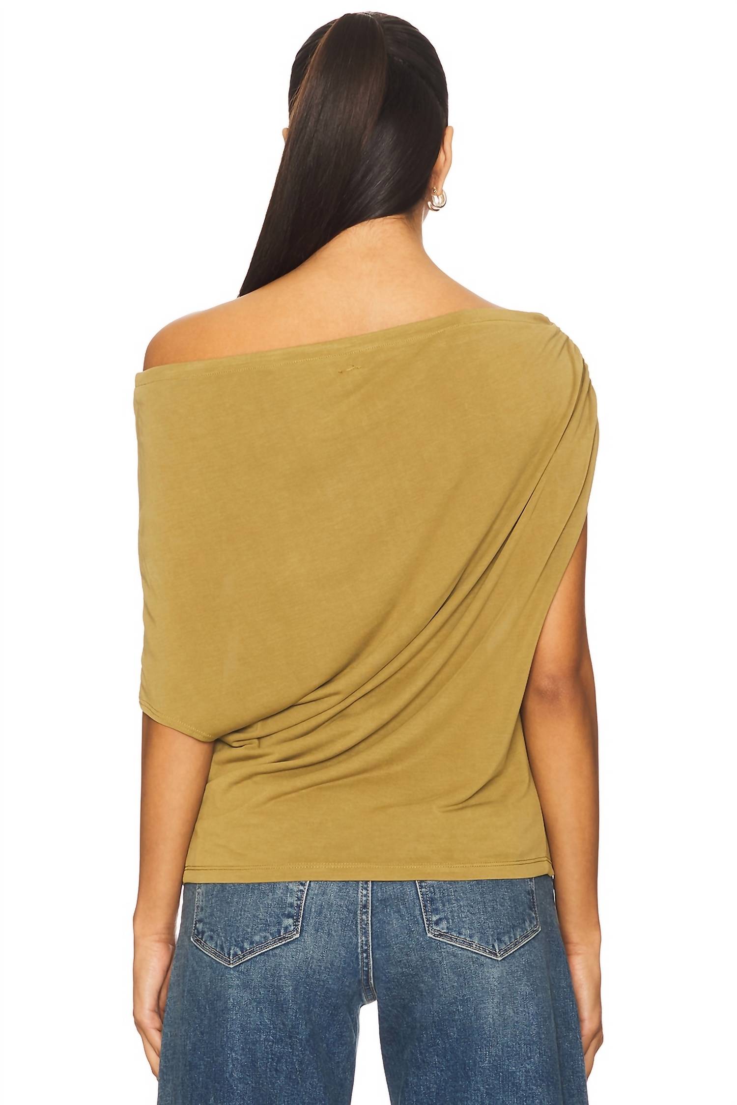 The Blake Knit Top by Free People is a minimalist must-have for any wardrobe, designed in an earthy Green Moss hue. This sleeveless blouse is crafted from soft Modal material and features a chic off-the-shoulder neckline with ruched detailing, offering a relaxed, drapey fit perfect for summer vacations. Material: Modal. Closure: Pull on. Care: Machine wash.