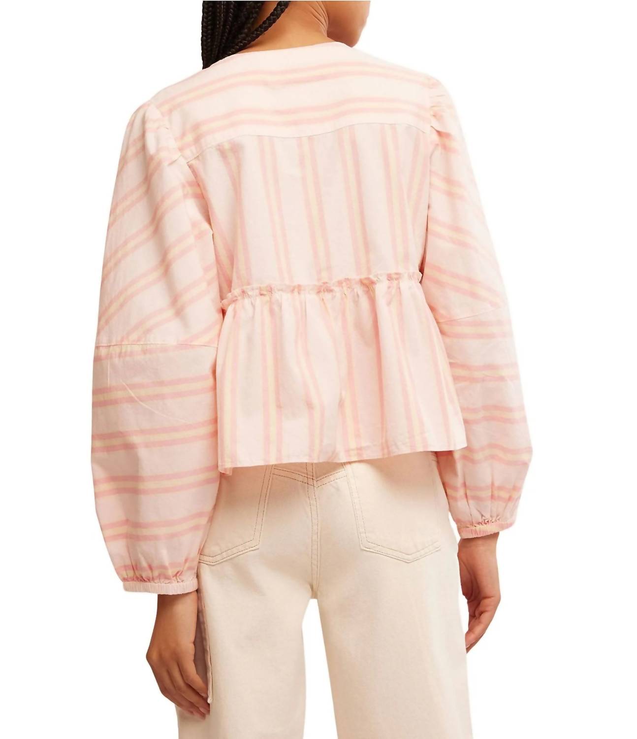 Pair this with your favorite jeans and slides for your next girls night out. Discover the Brunch Babe Blouse by Free People, a vibrant addition to your wardrobe with its delightful pink and yellow stripe pattern. Crafted from soft cotton, this boho-chic blouse features long sleeves and a V-neckline with a tie closure for a customizable fit. With a 22.5-inch length, it's perfect for a summer music festival or a Valentine's Day outing. Care: Machine wash and lay flat to dry for best results.