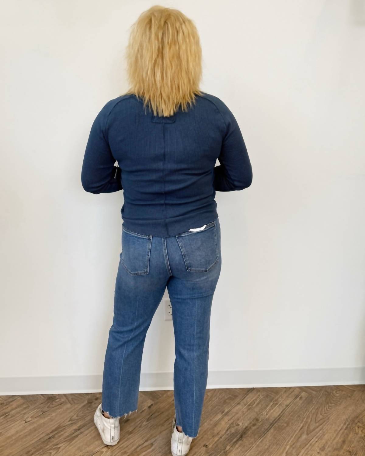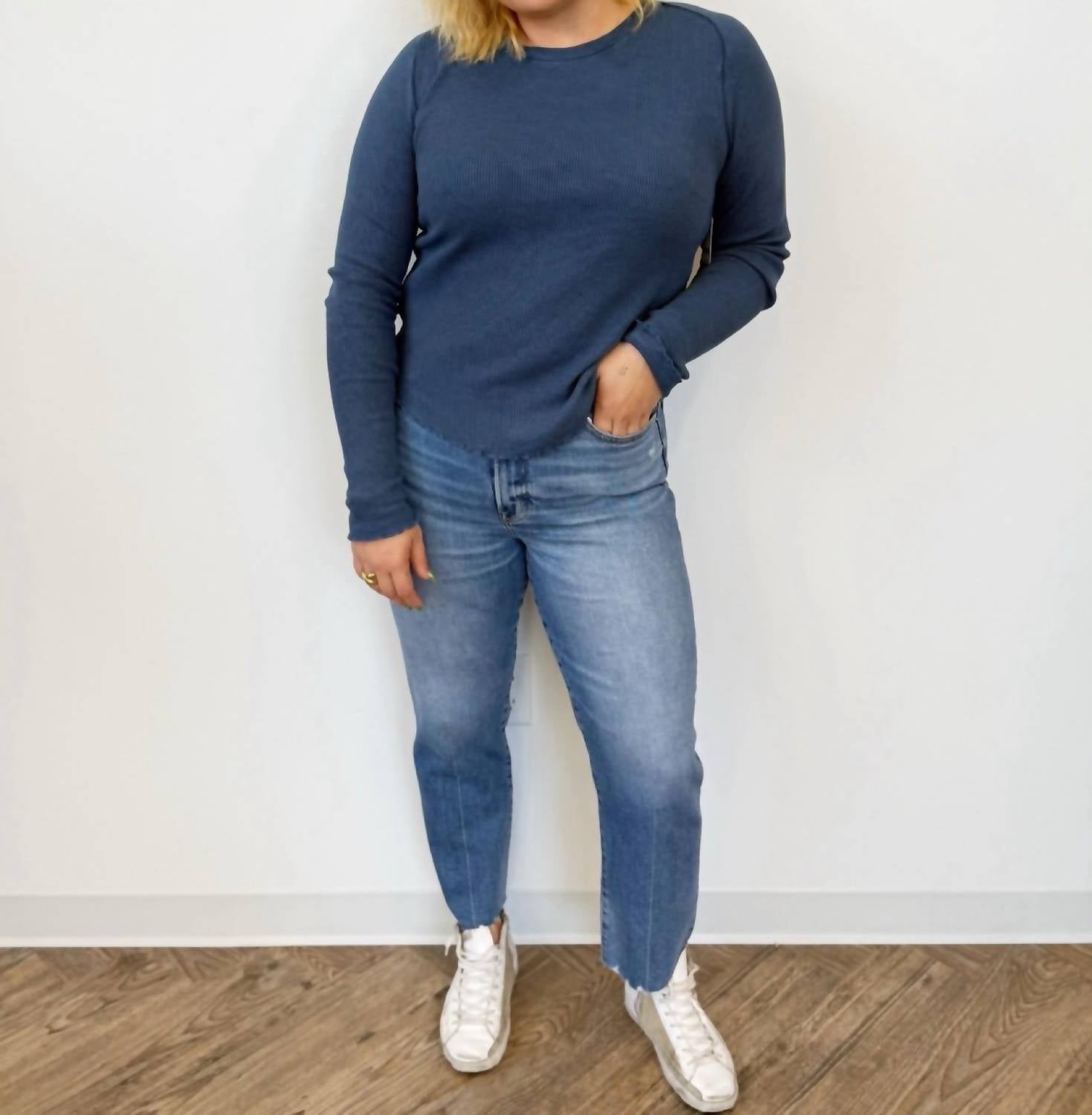 Great fit, cute design, soft fabric. You'll love everything about this long sleeve tee. Meet the Carmine Waffle Knit Long Sleeve Top by Free People, a textured essential in a charming rinsed navy hue. This women's top boasts a comfortable waffle-knit texture with raglan-cut sleeves and lettuce-edge trim, ensuring both style and comfort. Closure: Pull-on. Ideal for vacation wear with a minimalist trend, this piece showcases a crewneck for a classic touch.