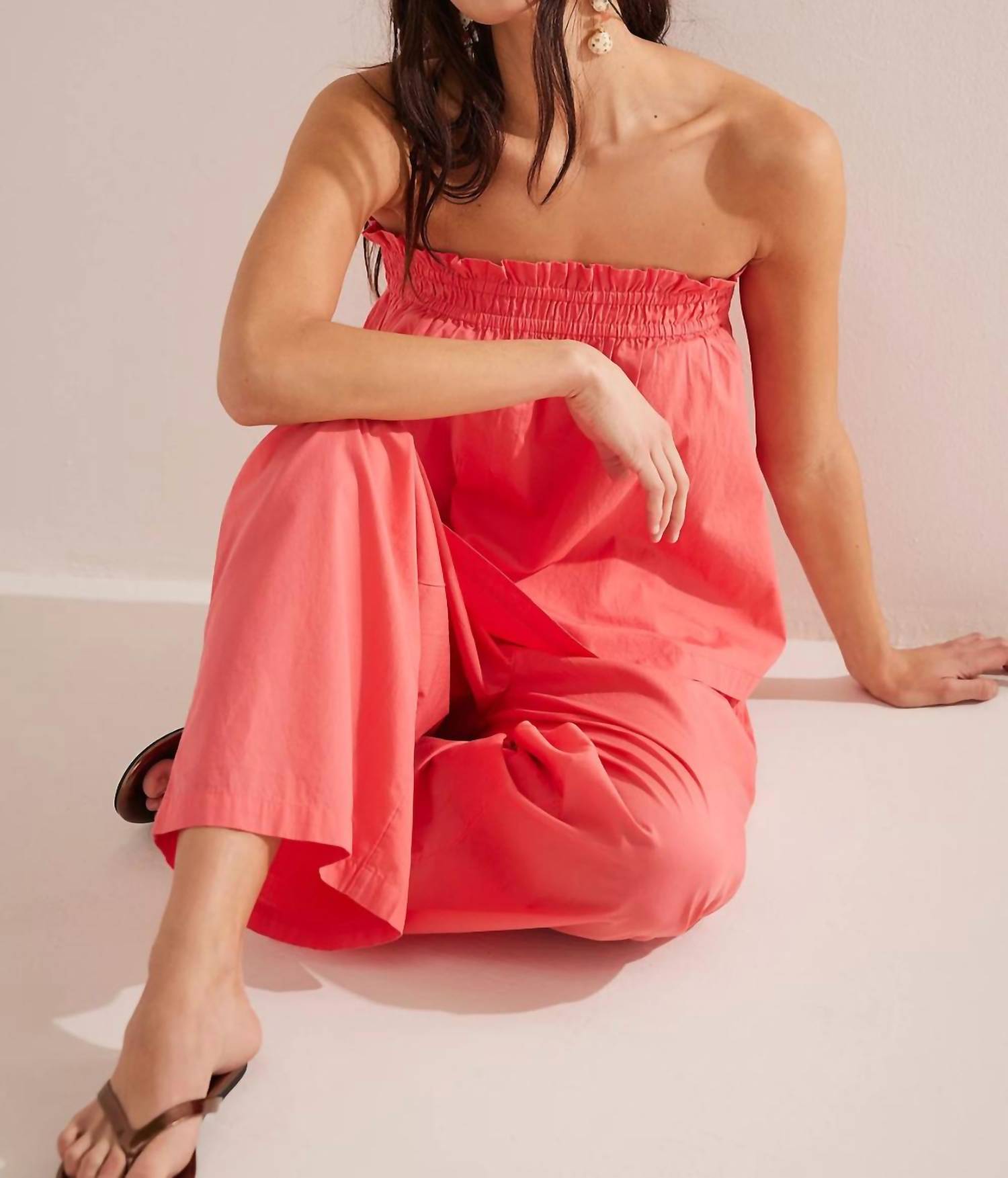 A set so cute you'll never want to take it off. Designed to look good while lounging, this little number is the perfect outfit for hanging at home in style. The Free People Corfu Tube Set in Sugar Coral offers a stylish and effortless option for a laid-back look. This set features a strapless top with a smocked neckline and ruffle trim, paired with wide-leg pants that include side pockets. Crafted from lightweight and breathable 100% cotton, it is perfect for travel and is ideal for the spring season. Care instructions: Machine wash cold, line dry.