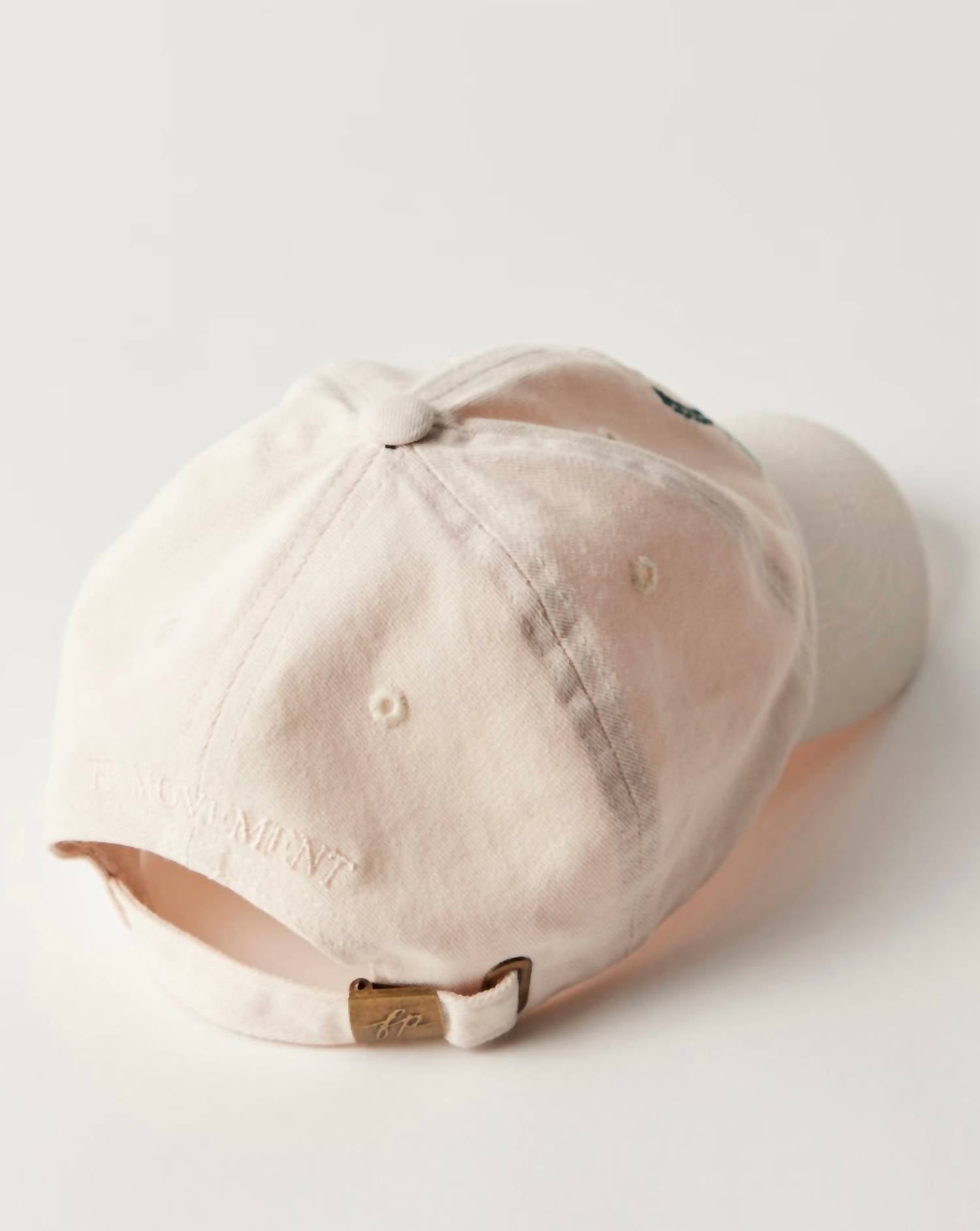 Not only will this hat get you tons of compliments, but it will also keep the sun out of your face which is a must! Wear it with any outfit for the perfect finishing touch. Introducing the Court & Club Baseball Hat by Free People in an elegant Ivory Wash, perfect for adding a finishing touch to your activewear looks. Made from 100% cotton, this stylish cap features a paneled round crown, a button top, and a beautifully embroidered floral buti logo for a feminine flair. It includes a curved brim and an embroidered script logo on the back, complete with an adjustable metal clasp closure for a customized fit. The ideal grab-and-go staple, it effortlessly elevates your style on both good and bad hair days.