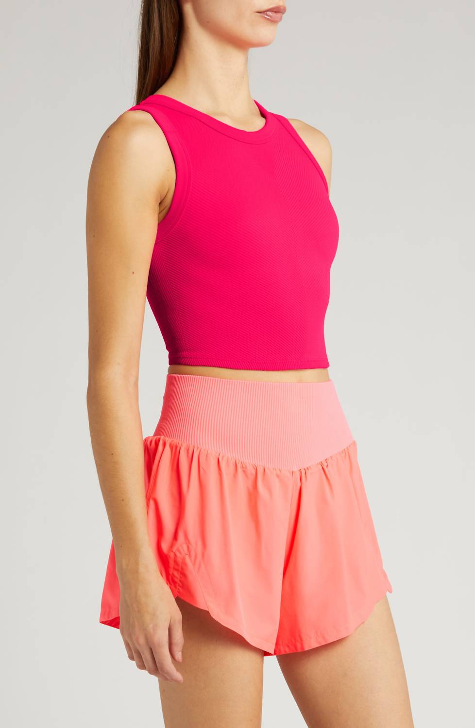 Introducing the Free People Crop Muscle Tank Top in the vibrant Electric Sunset color, perfect for your athleisure wardrobe. This sleeveless design features a stretchy, ribbed knit fabric with a compressive fit and a slight scoop neckline. The tank is crafted for a cropped, muscle-style silhouette, ideal for fitness and workout occasions. Closure: Pull on. Care: Hand wash and lay flat to dry.