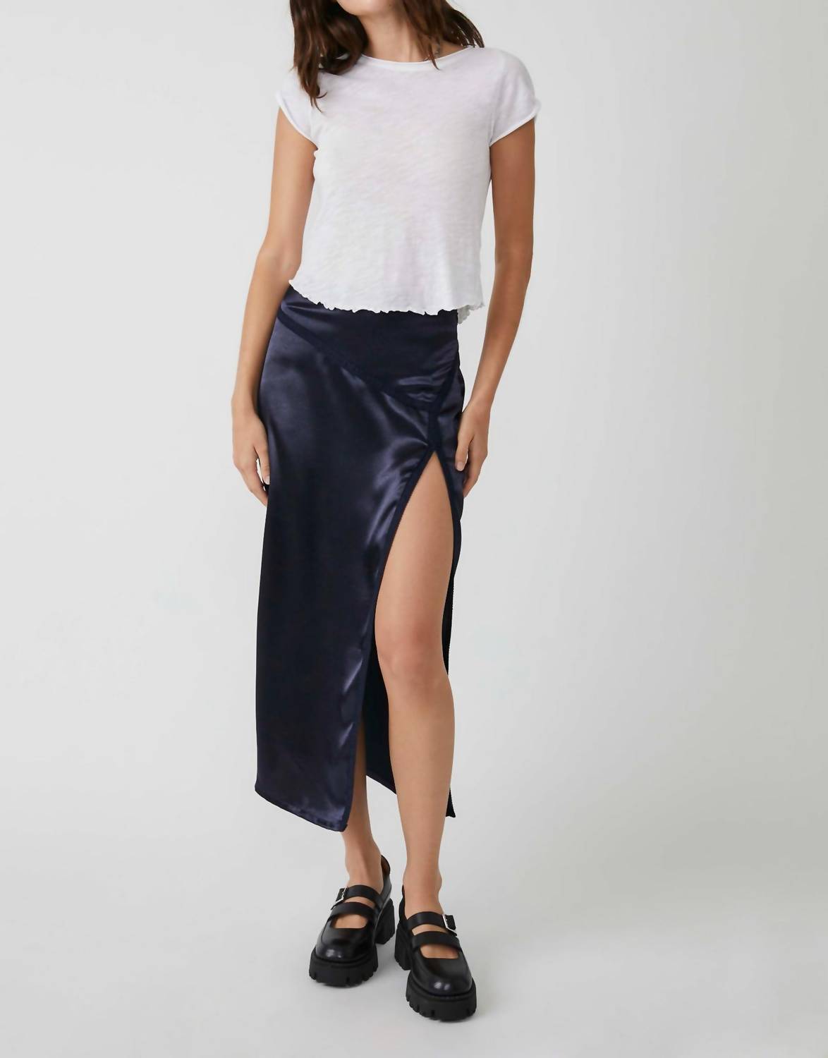 Show off just the right amount of skin in this beautifuly designed midi length skirt. Meet the Dakota Satin Midi Skirt by Free People, a sophisticated addition to your summer wardrobe in elegant navy. Featuring a mid-rise, slim silhouette with 100% Polyester composition, this skirt includes raised border trimming and an exaggerated slit hem for a touch of drama. It has a 35.5-inch length and a 32-inch waist for size 6, secured with an invisible zip closure. Care for this imported piece is effortless with machine wash cold, gentle cycle, and line dry instructions.