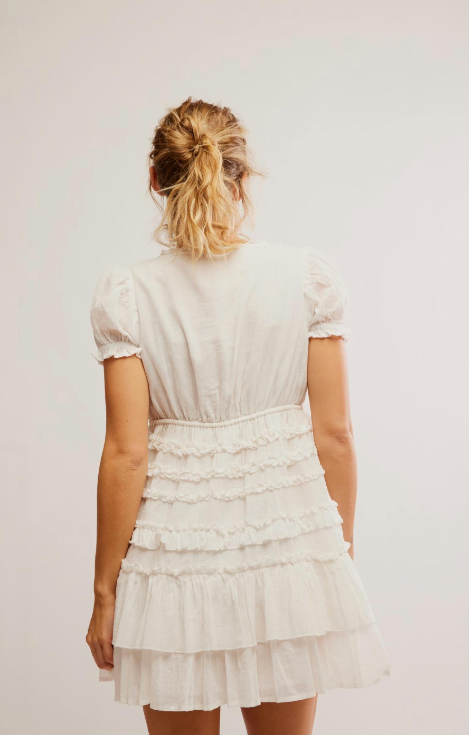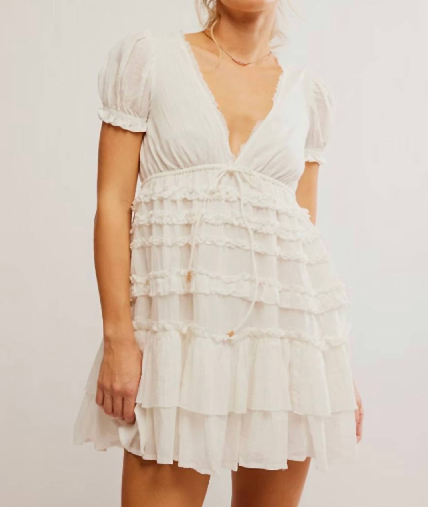 The kind of easy and flattering dress you'll be reaching for all season long. Meet the Darcy Mini Dress by Free People, a perfect embodiment of timeless elegance in a sweet and fluttery design. Crafted from 100% cotton with a lining of the same material, this ivory dress showcases a flattering V-neckline. Featuring short puffed sleeves, tiered ruffle trimming, and a unique drawstring detail at the bust, it offers an A-line babydoll silhouette that effortlessly enhances your look. Seamless with a pull-on closure, it is imported and easy to care for with machine wash cold instructions. Measurements for size small: 42" bust, 32" length, and 8.5" sleeve length.
