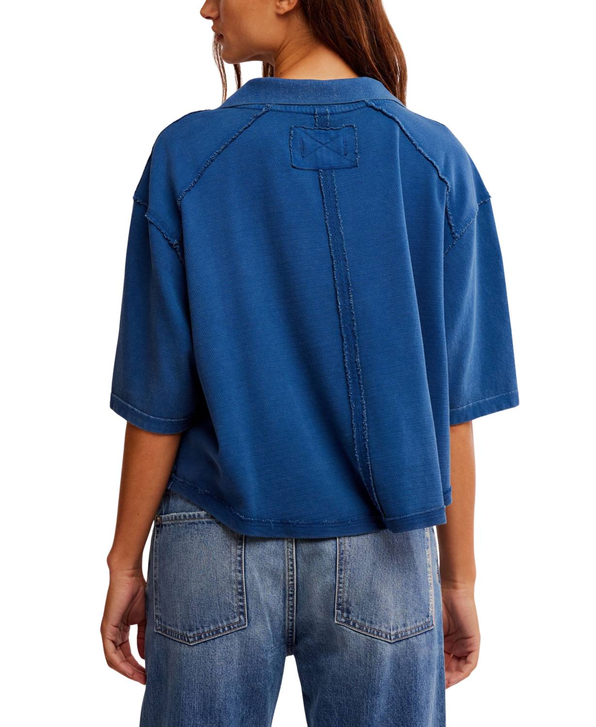 Show a little skin in this cute and casual crop top. Discover the Denmark Cropped Polo by Free People, a chic and comfortable addition to your spring collection. Crafted in a vibrant Bell Weather Blue, this short sleeve top features a classic collar and a solid pattern. The design is oversized and cropped, with a convenient pull-on closure. Care instructions: Machine wash. Perfect for vacation vibes and capturing that 90s fashion trend.