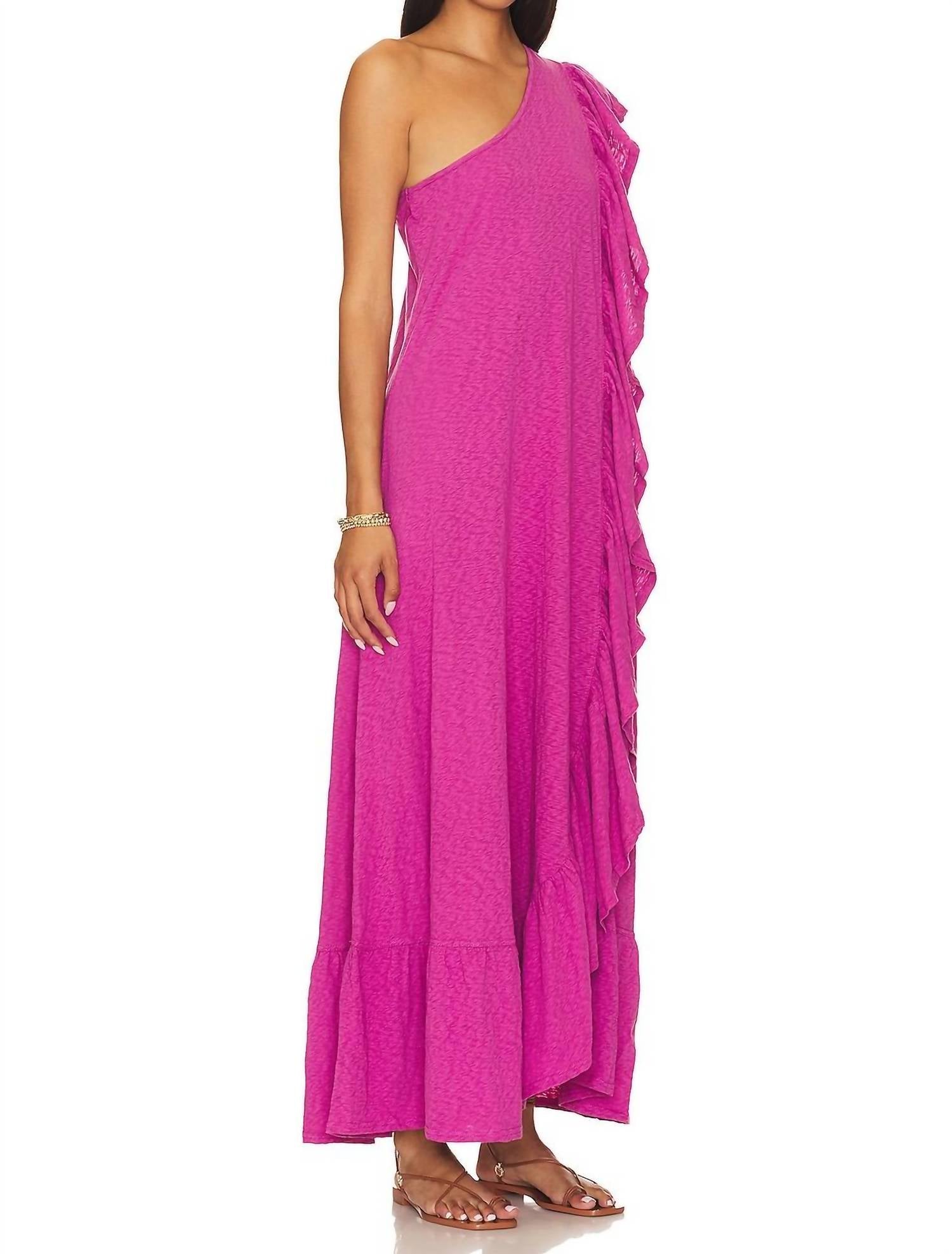A maxi dress that is just as cute as it is comfortable. 100% Cotton. Unlined. Pull-on styling. One shoulder styling cascading ruffle detail at side. Midweight slub jersey fabric. Machine wash. Made in India. Model is wearing size: XS [Height: 5' 9'', Waist: 24'', Bust: 32'', Hips: 34'']. Product Measurements [Shoulder seam to hem measures approx 145 cm in length]
