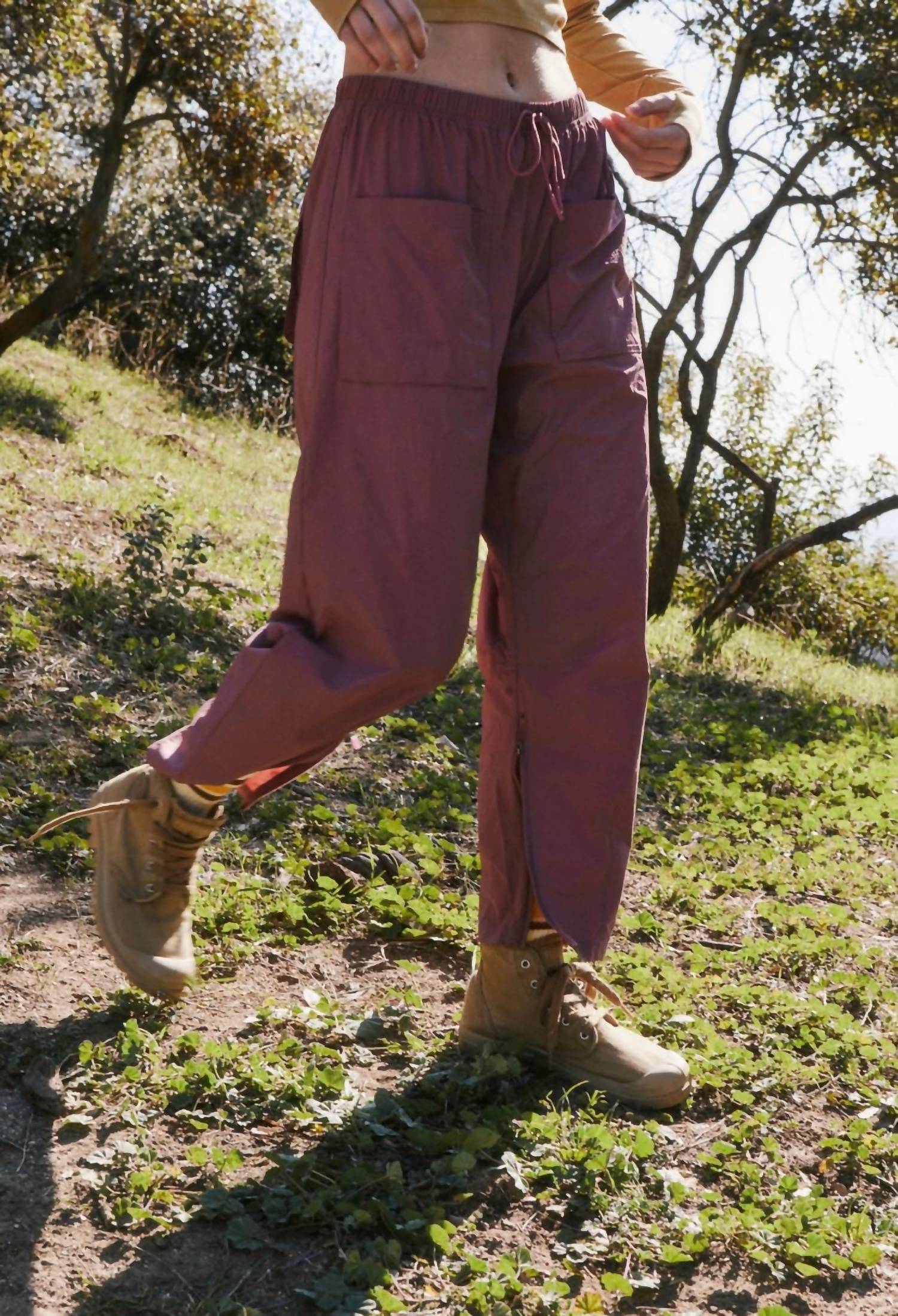 A straightleg pant that workes season after season. Dress these up with your favorite blouse or keep it casual with your go-to tee. Introducing the Fly By Night Pants by Free People, crafted for the adventurous at heart. These women's pants boast a mid-rise, relaxed fit with a stylish straight-leg silhouette, perfect for hiking or outdoor activities. Made from 100% polyamide, they feature a water-resistant and lightweight design with a smocked elastic waistband, adjustable bungee cord, and cargo-inspired pockets. Care: Machine wash cold. Measurements for size small include a 29.5" waist, 44" hips, 12" rise, and 25.5" inseam.